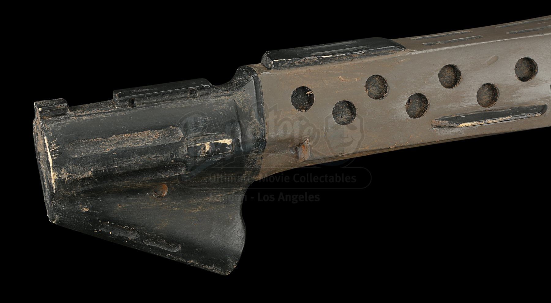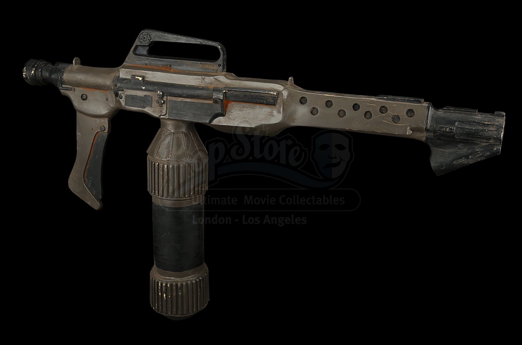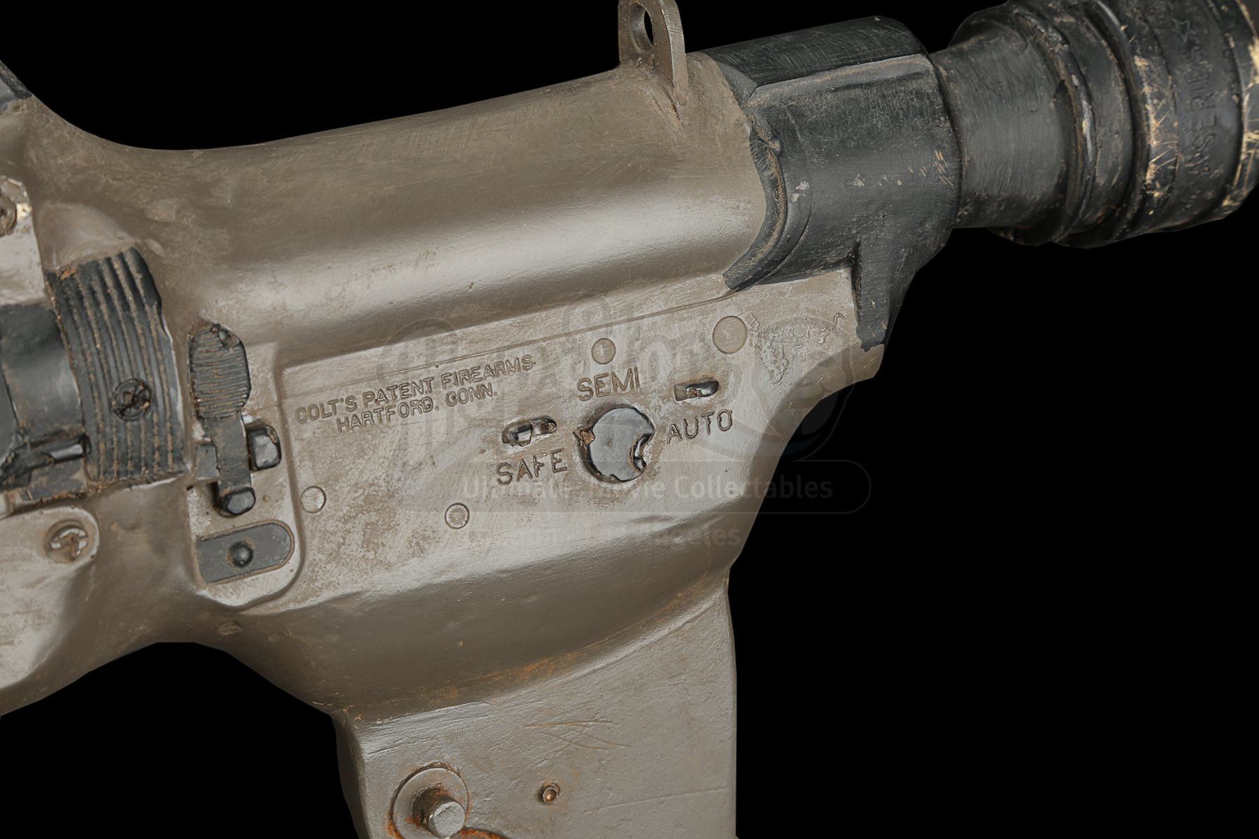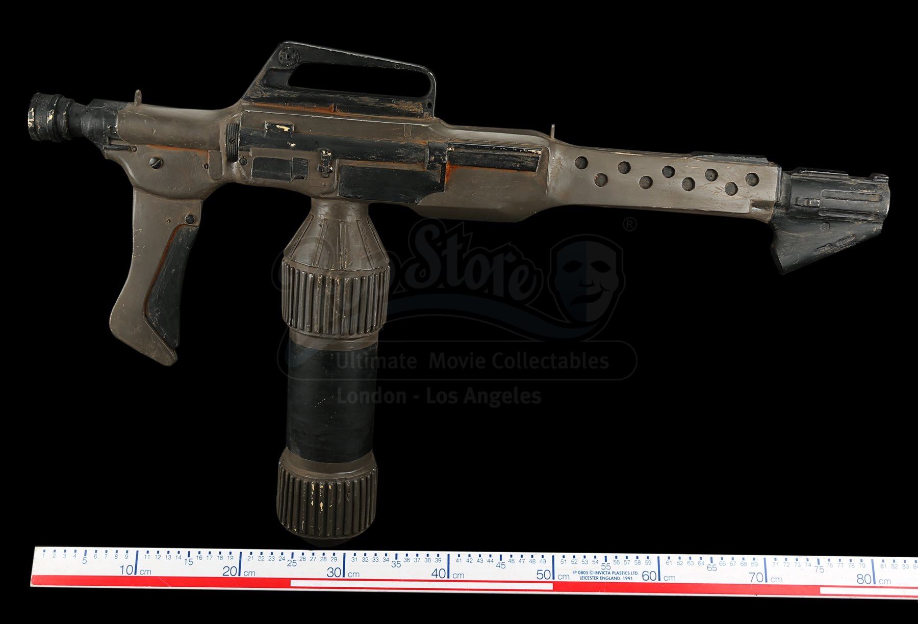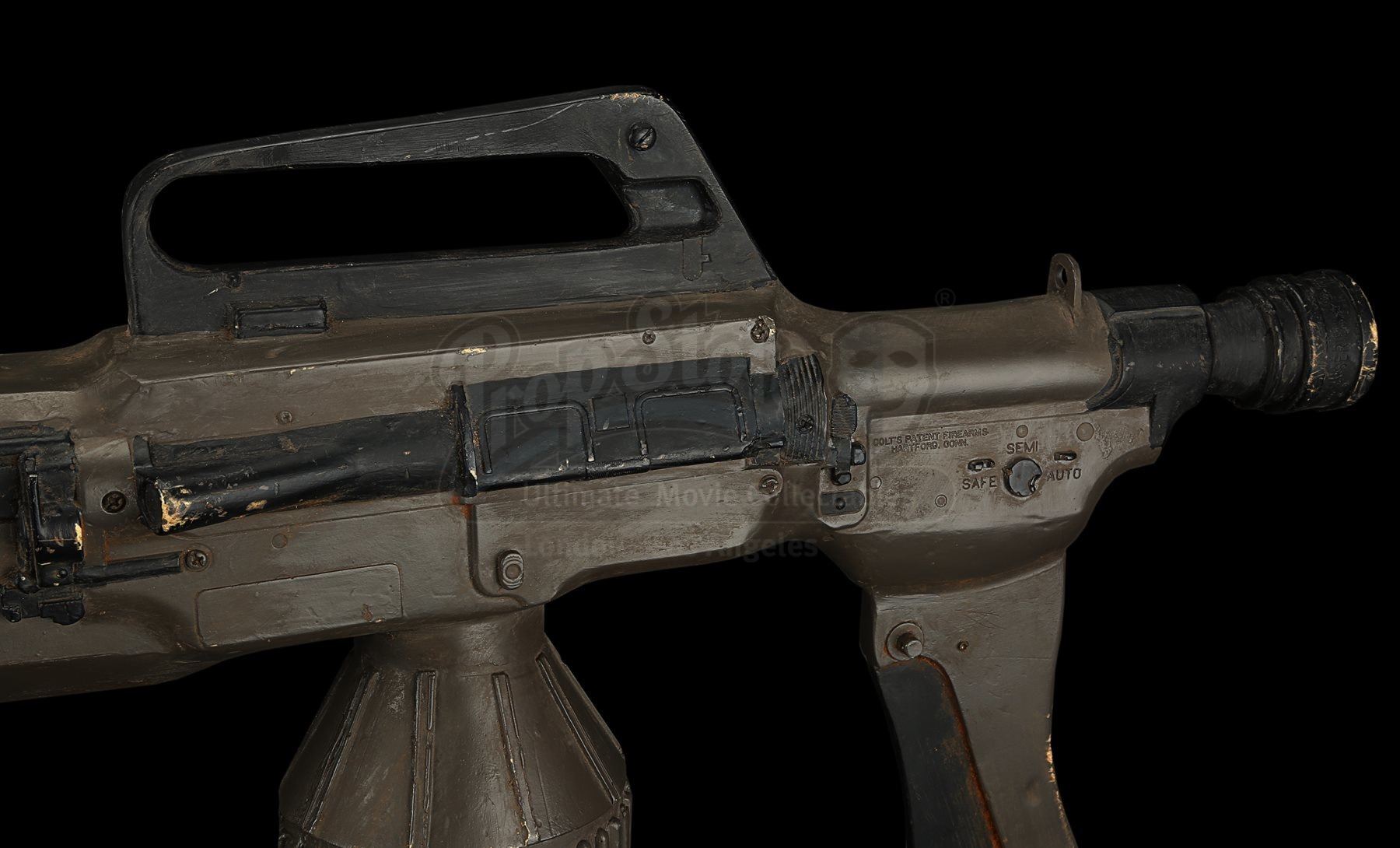 SFX supervisor John Richardson and conceptual designer Ron Cobb created several different versions of each weapon for production. This item is loosely based on existing military hardware, consisting of two M16 rifles spliced together, while the front section is based on an M203 grenade launcher with its handle and receiver sections evident at the centre. A Colt Patent Firearms logo is embossed near the butt end.