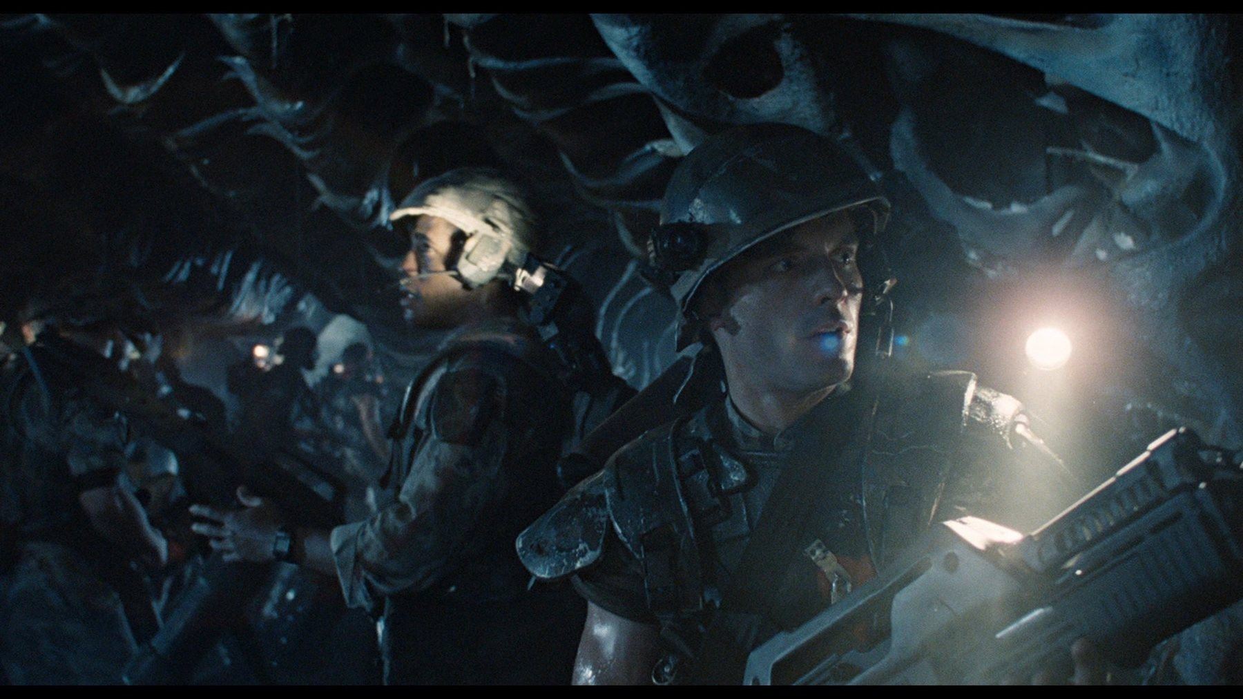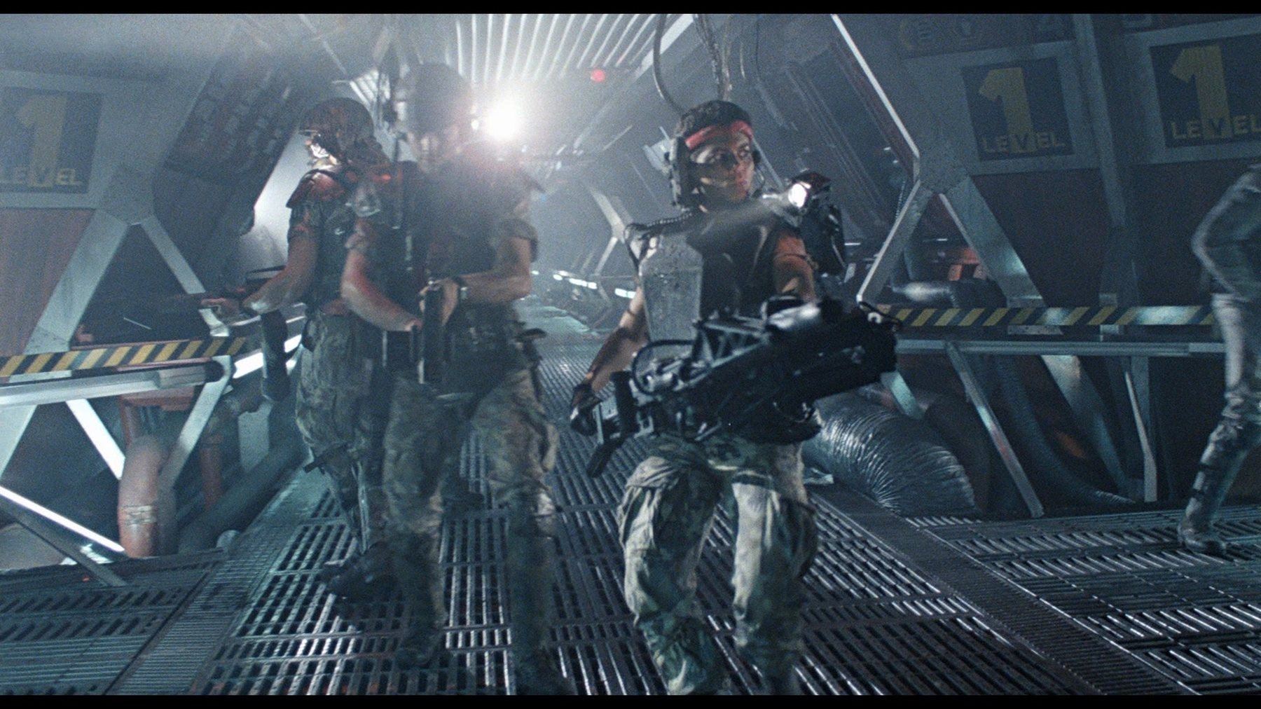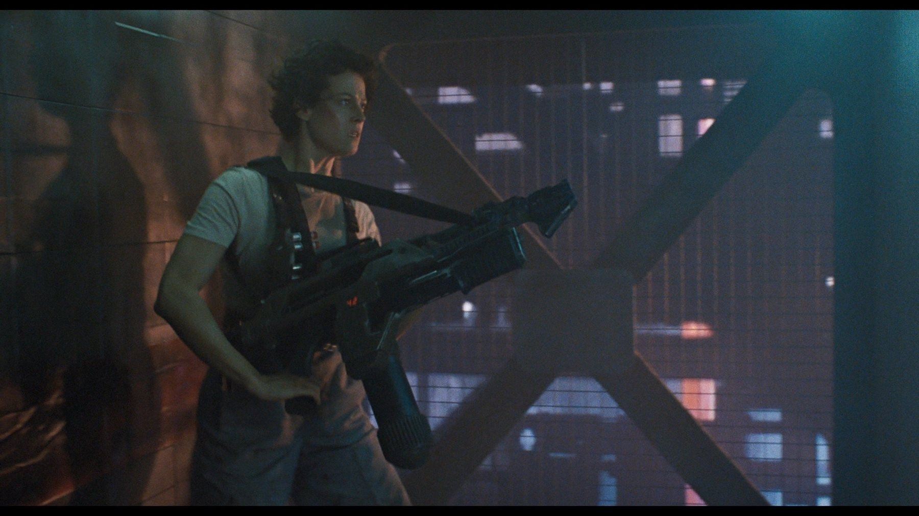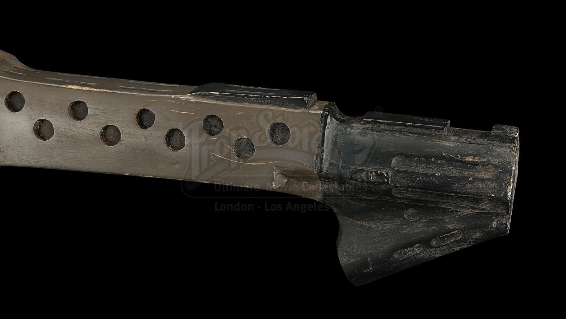 SFX supervisor John Richardson and conceptual designer Ron Cobb created several different versions of each weapon for production. This item is loosely based on existing military hardware, consisting of two M16 rifles spliced together, while the front section is based on an M203 grenade launcher with its handle and receiver sections evident at the centre. A Colt Patent Firearms logo is embossed near the butt end.