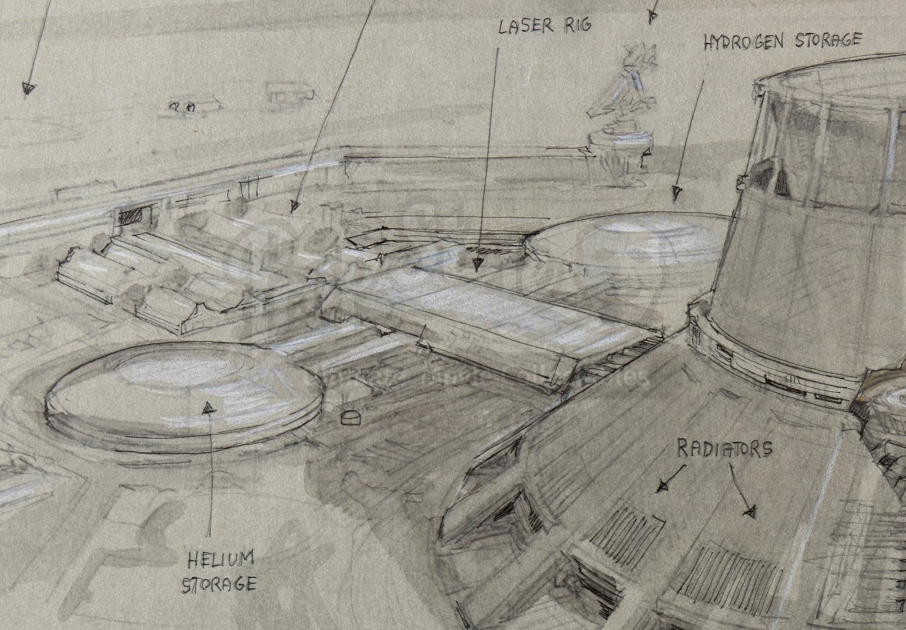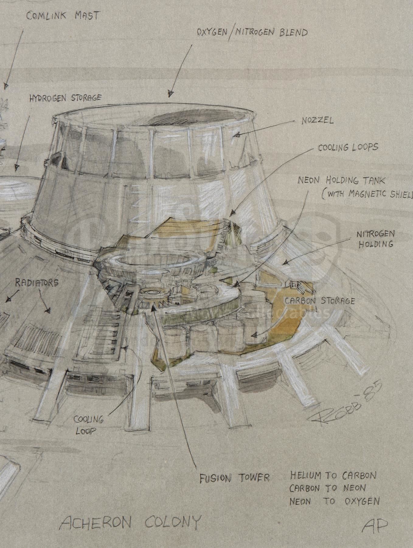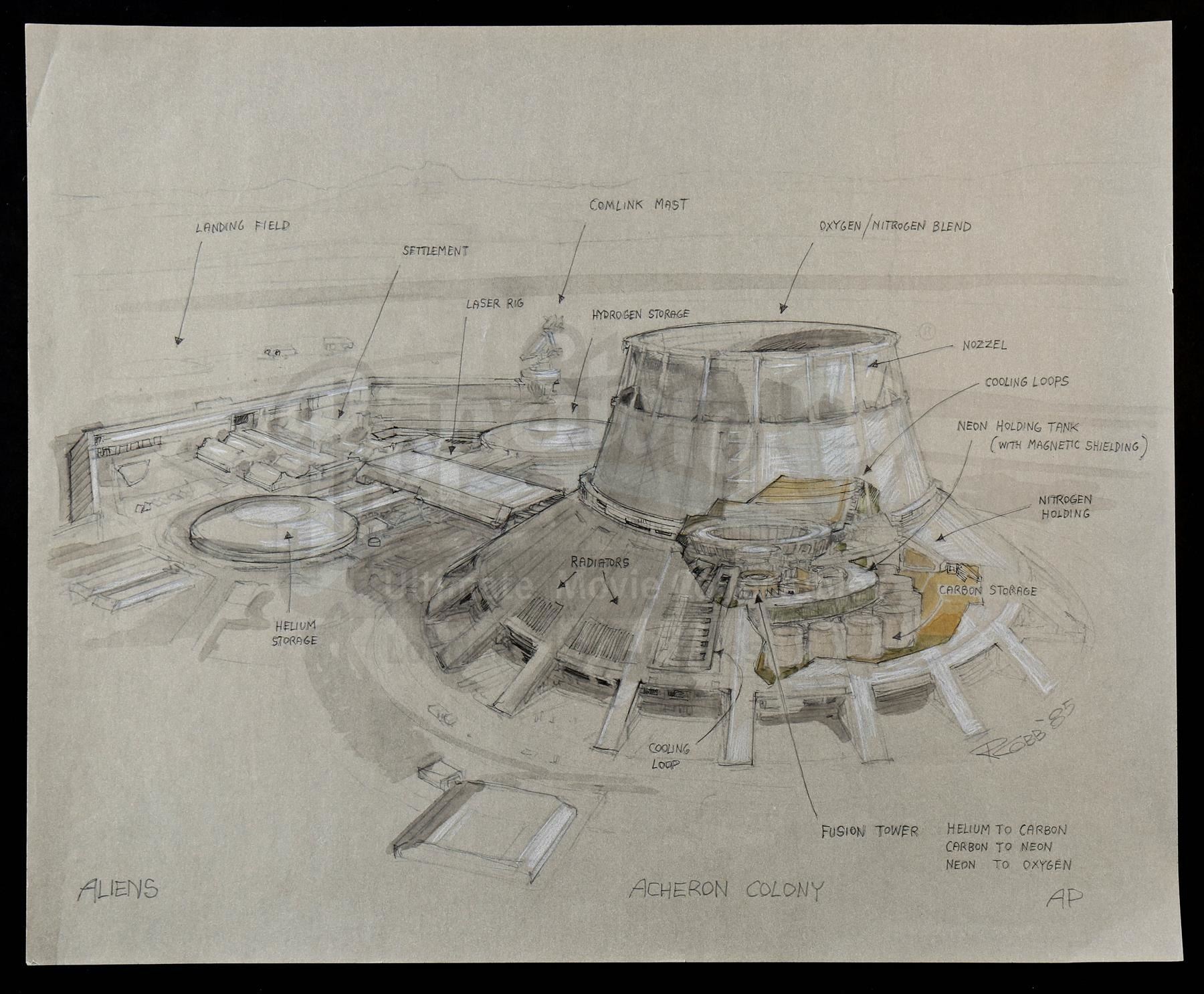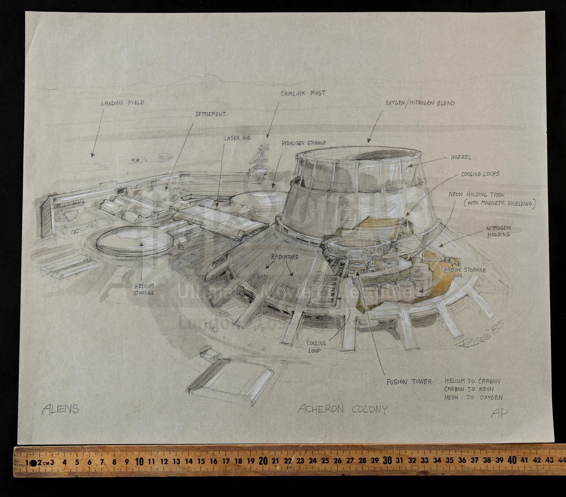 A hand-drawn Ron Cobb "Acheron Colony" concept sketch from the production of James Cameron's 1986 sci-fi horror sequel Aliens. Ellen Ripley (Sigourney Weaver) and a group of Colonial Marines were besieged by xenomorphs while investigating the Hadley's Hope colony on the terraformed moon LV-426, also known as Acheron.