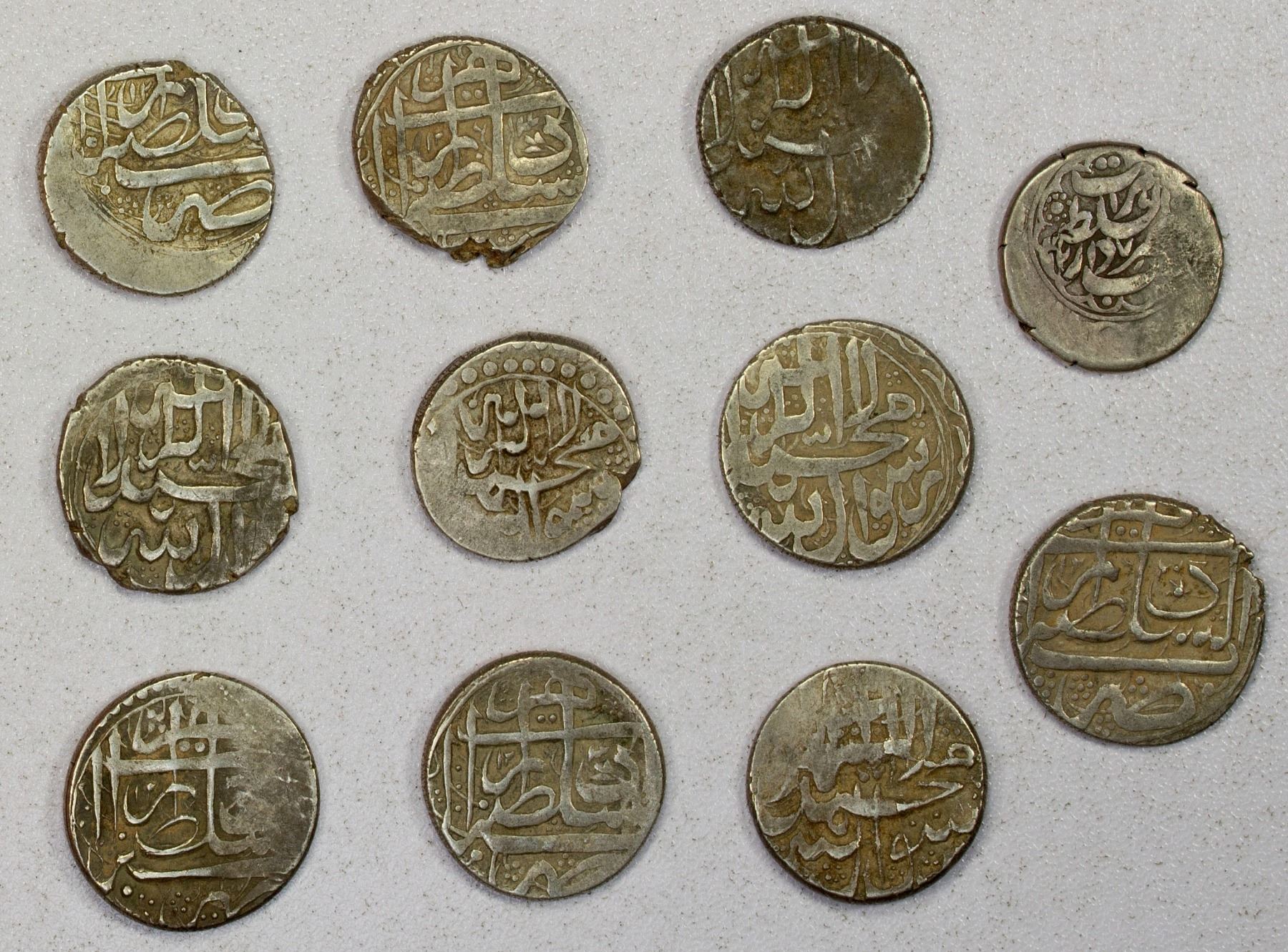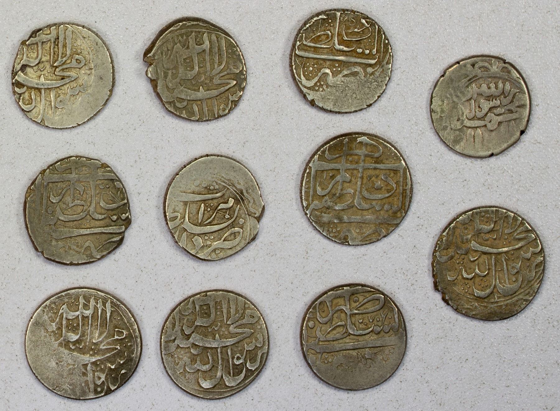 ALIKOZAY: LOT of 11 silver qirans, Yar Muhammad Khan: type A-3153.2, at standard of 5.37g, including the years AH1263, 1263, 1264, 1265, 1266, and several without legible date (9 pcs); and Sa'id Muhammad Khan: A-3156, reduced standard of 4.76g, both with date off (2 pcs); nearly all in VF condition, but all with the usual weakness around the rims; retail value $400, lot of 11 pieces.