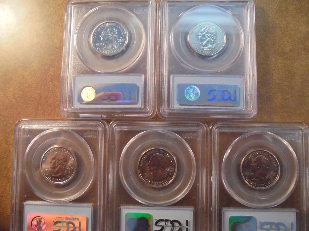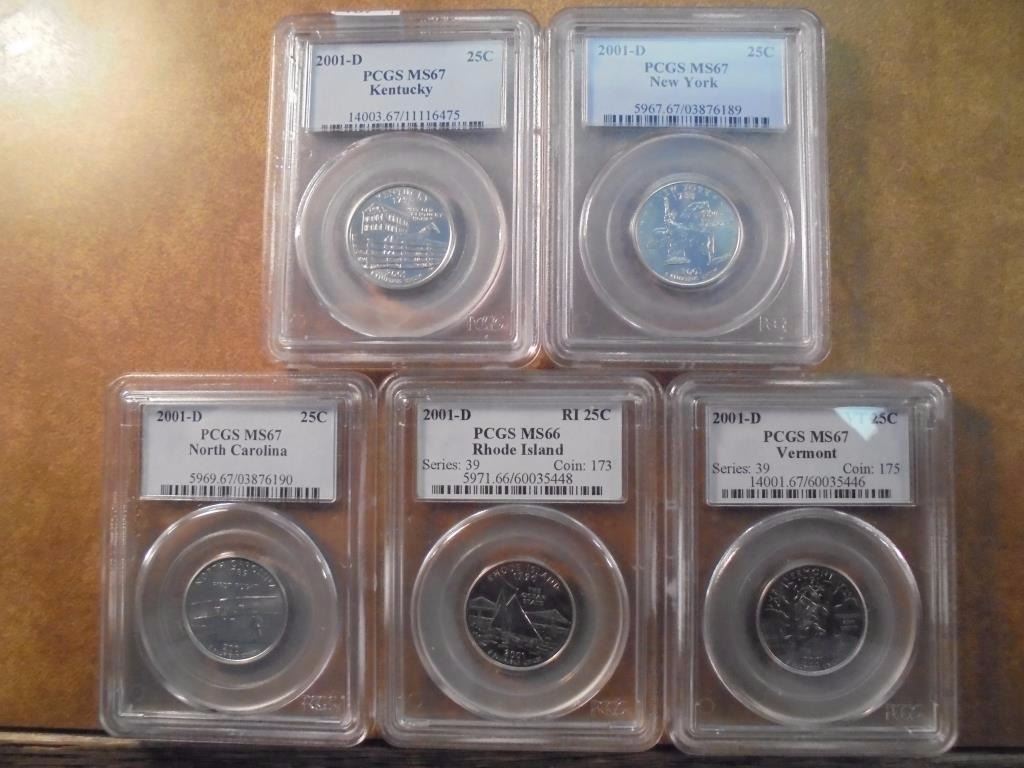ALL 5-2001-D US 50 STATE QUARTERS PCGS SLABS KENTUCKY MS67, NEW YORK MS67, NORTH CAROLINA MS67, RHOD