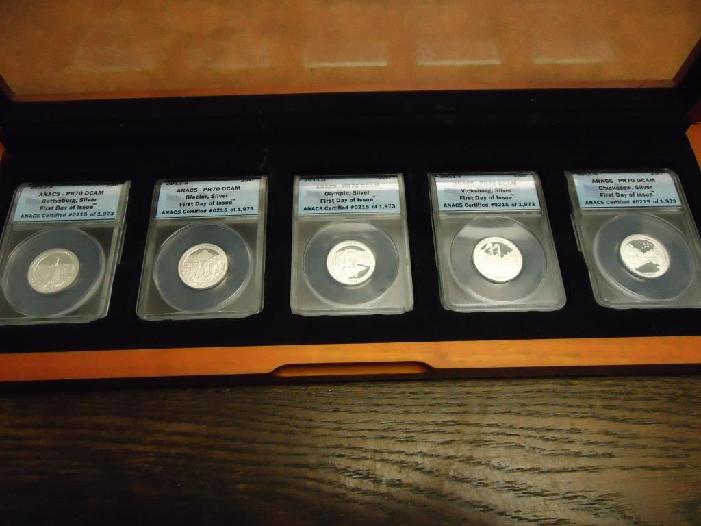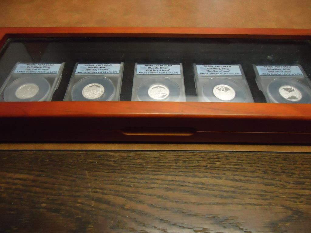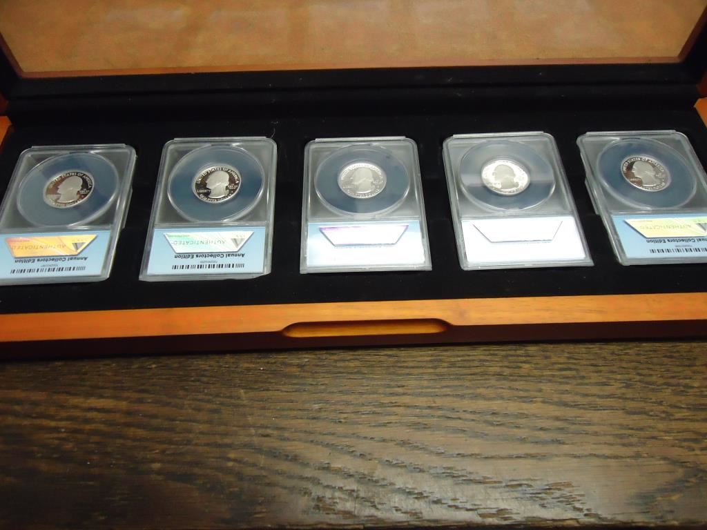 ALL 5-2011-S SILVER 50 STATE QUARTERS ANACS PR70 DCAM'S, 1ST DAY ISSUE, IN NICE WOODEN CASE AS SHOWN