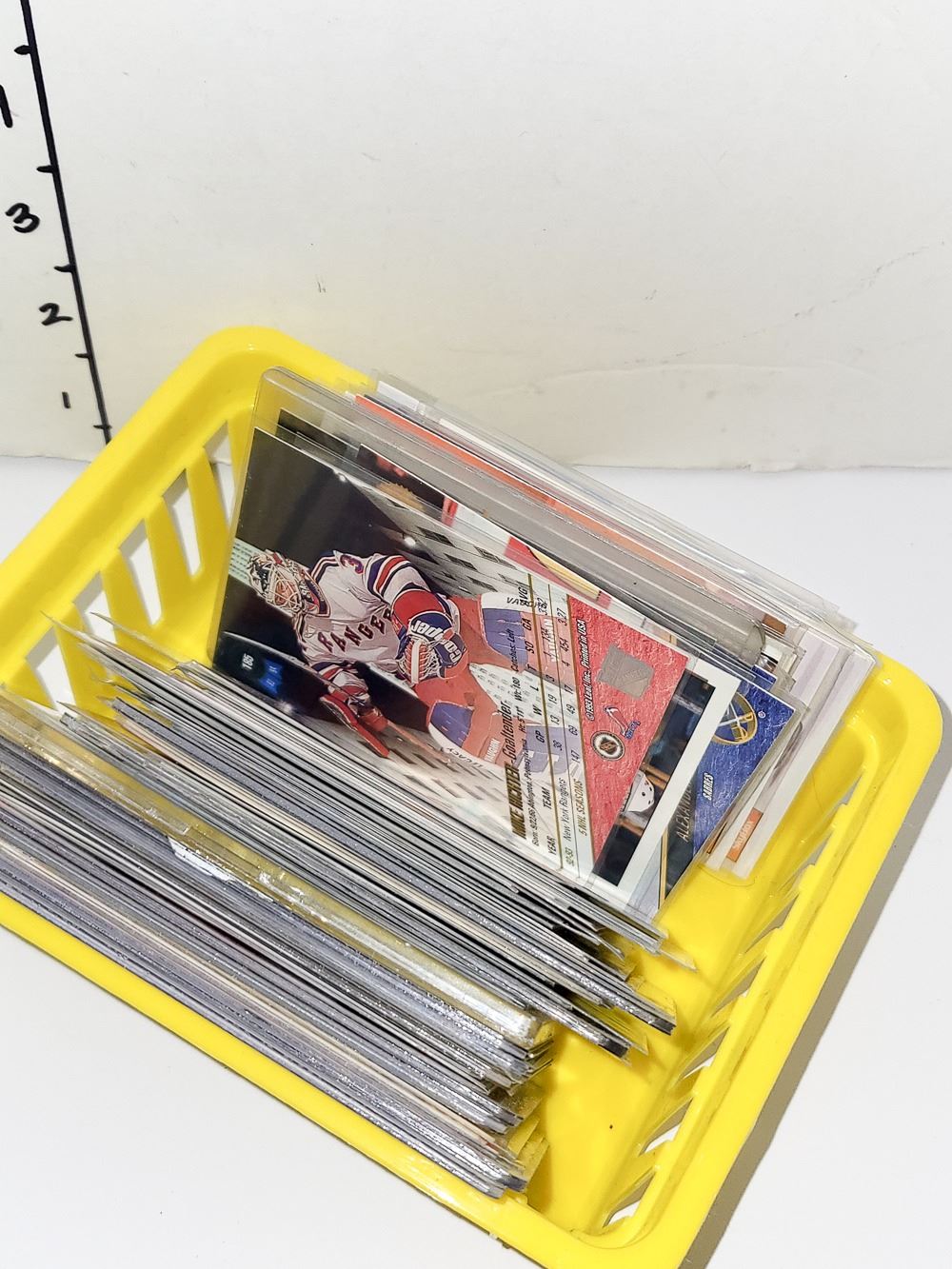 ALL CARDS PULLED WITH SLEEVES ON THEM (INCLUDING A MARIO LEMIUEX SIGNED CARD). ALL THESE CARDS WERE PULLED WHILE SORTING INTO TRADING CARD CATEGORIES. IT APPEARS THAT SOME OF THESE SLEEVES HAVE MULTIPLE CARDS IN THEM. THERE IS A MARIO LEMIUEX SIGNED CARD. UNAUTHENTICATED, BUT YOU CAN SEE THE DEPRESSION OF THE INK INTO THE CARD. UNSURE WHAT ELSE IN THE MIX