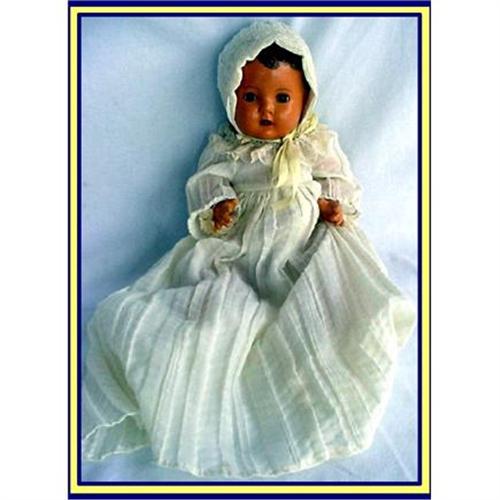 A 13inch all-composition baby doll almost certainly made by the Reliable company, Toronto Canada, early 20th century. Christening costume.<BR>The entire body and head are made of painted composition, which is in remarkably good condition, considering the age and delicate nature of the material. Moulded, painted hair, red painted mouth, brown glass eyes that close when she lies down and bristle eyelashes. Neck swivels as do arms and legs. <BR>The clothes are old style, but not original.<BR>There are no marks to be found on the doll, but she is very similar to the 17inch doll from the same collection, which is marked Reliable.<BR>Both dolls are in remarkable condition for their age - as close to mint as any composition doll. The only fault I could find on this doll is the left eye, which is milky.