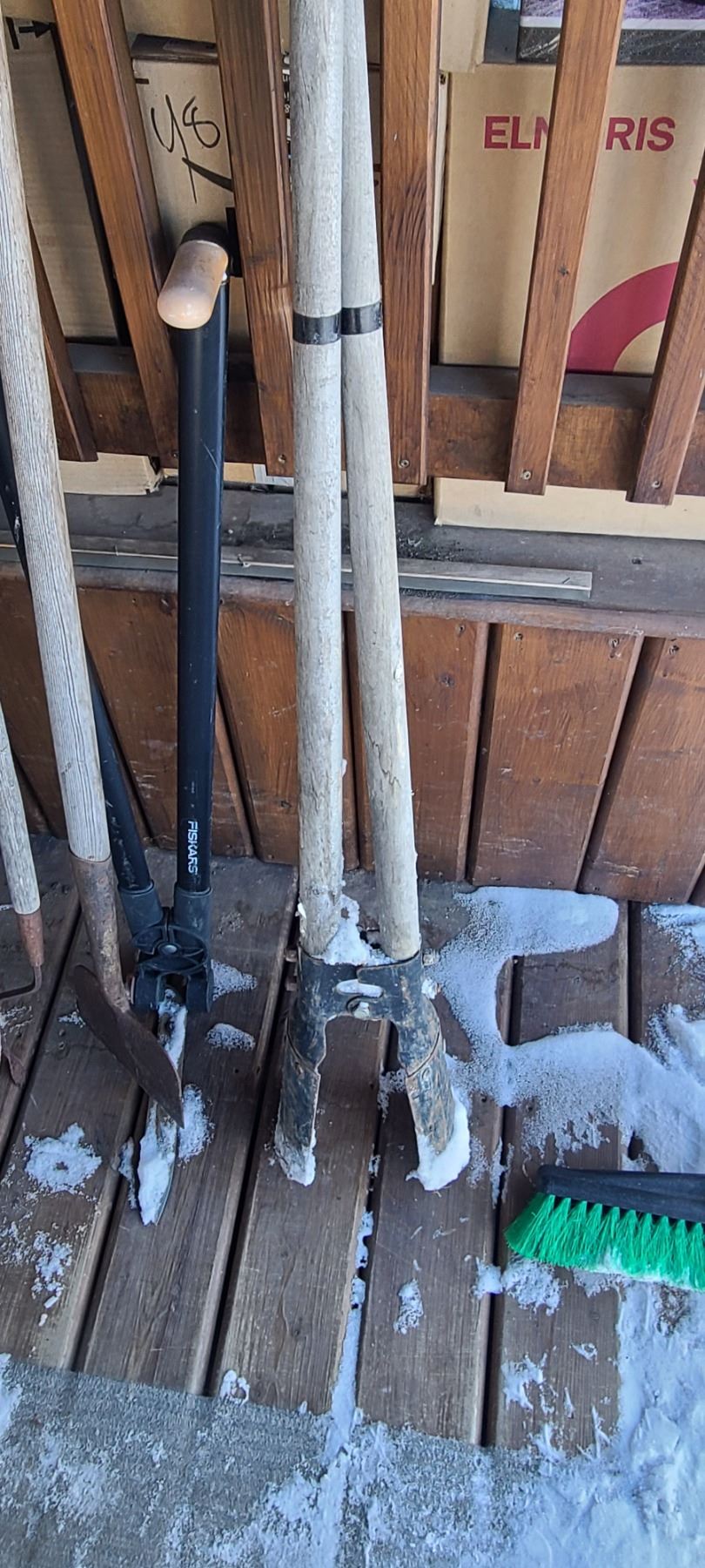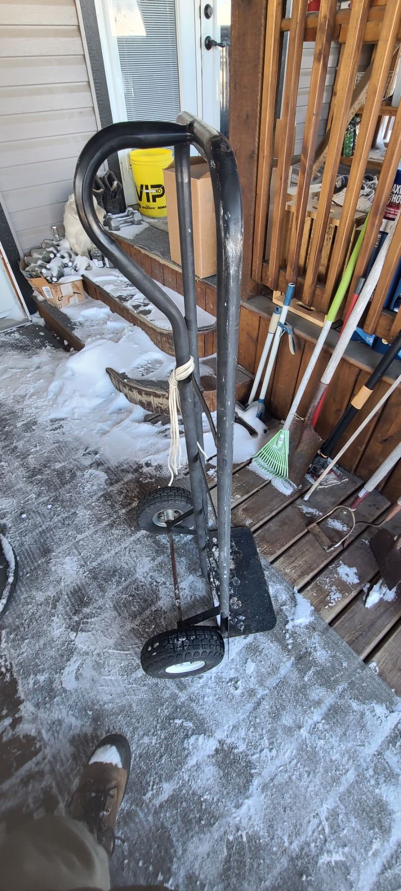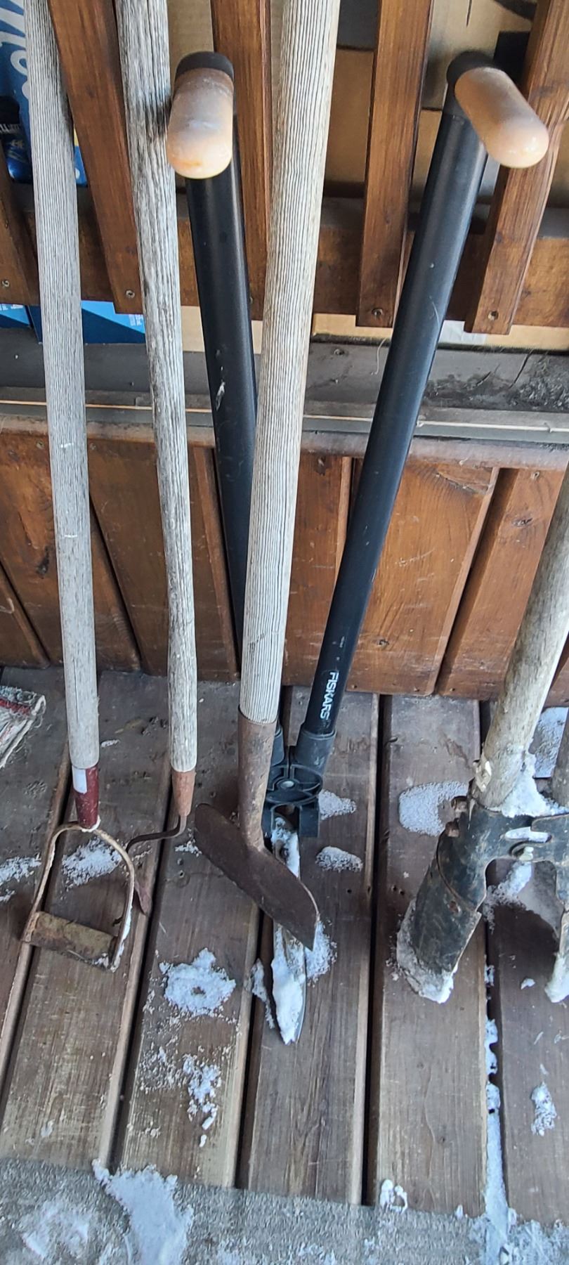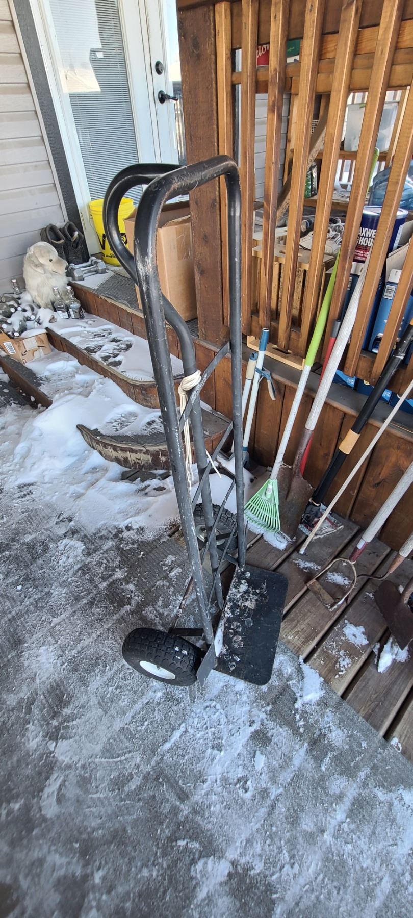 ALL GARDEN TOOLS, SHOVELS, ICE PICKS, AND 2 WHEEL DOLLY IN PHOTO
