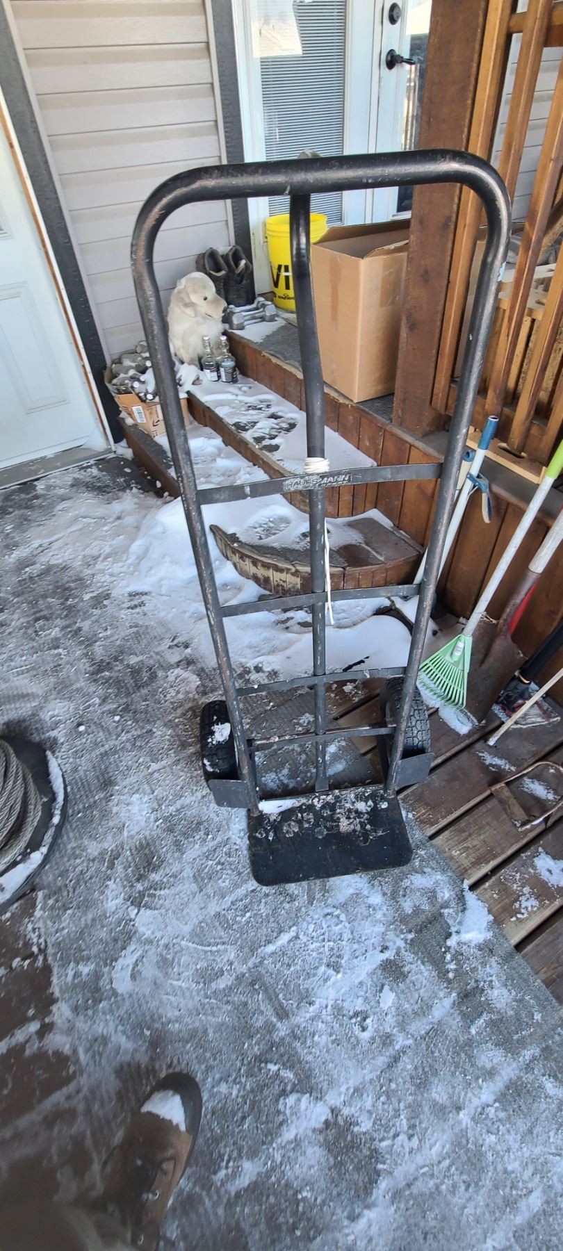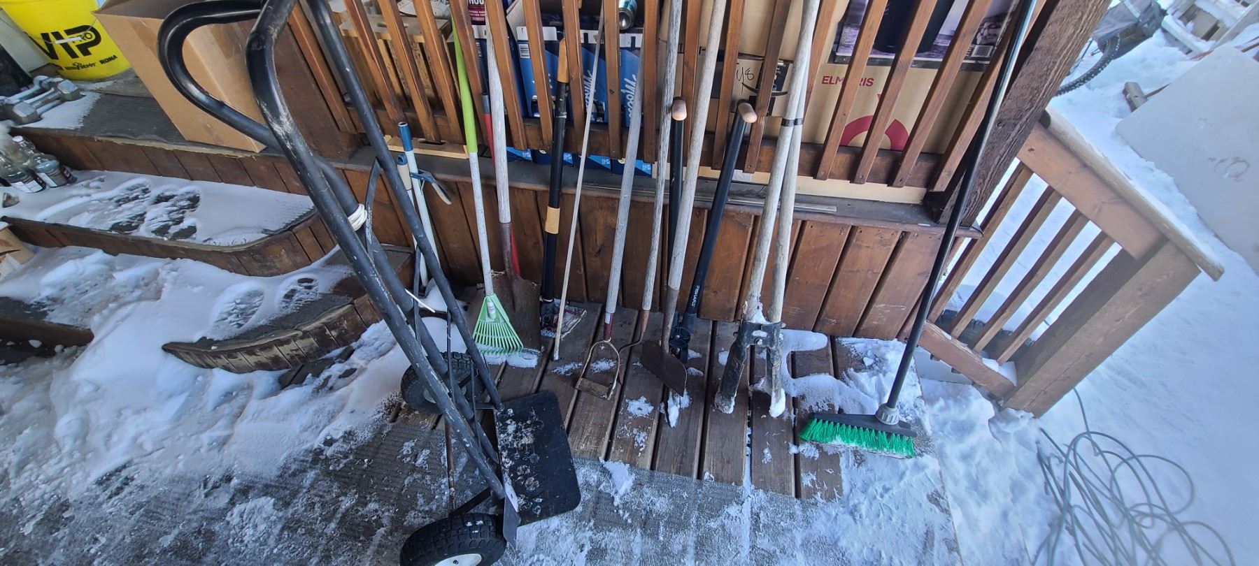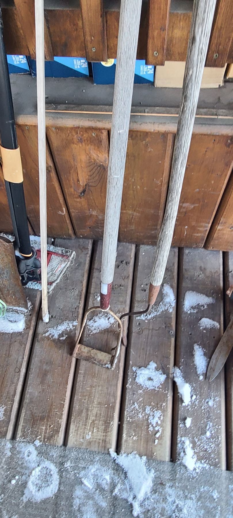 ALL GARDEN TOOLS, SHOVELS, ICE PICKS, AND 2 WHEEL DOLLY IN PHOTO
