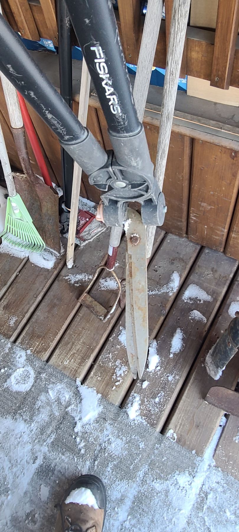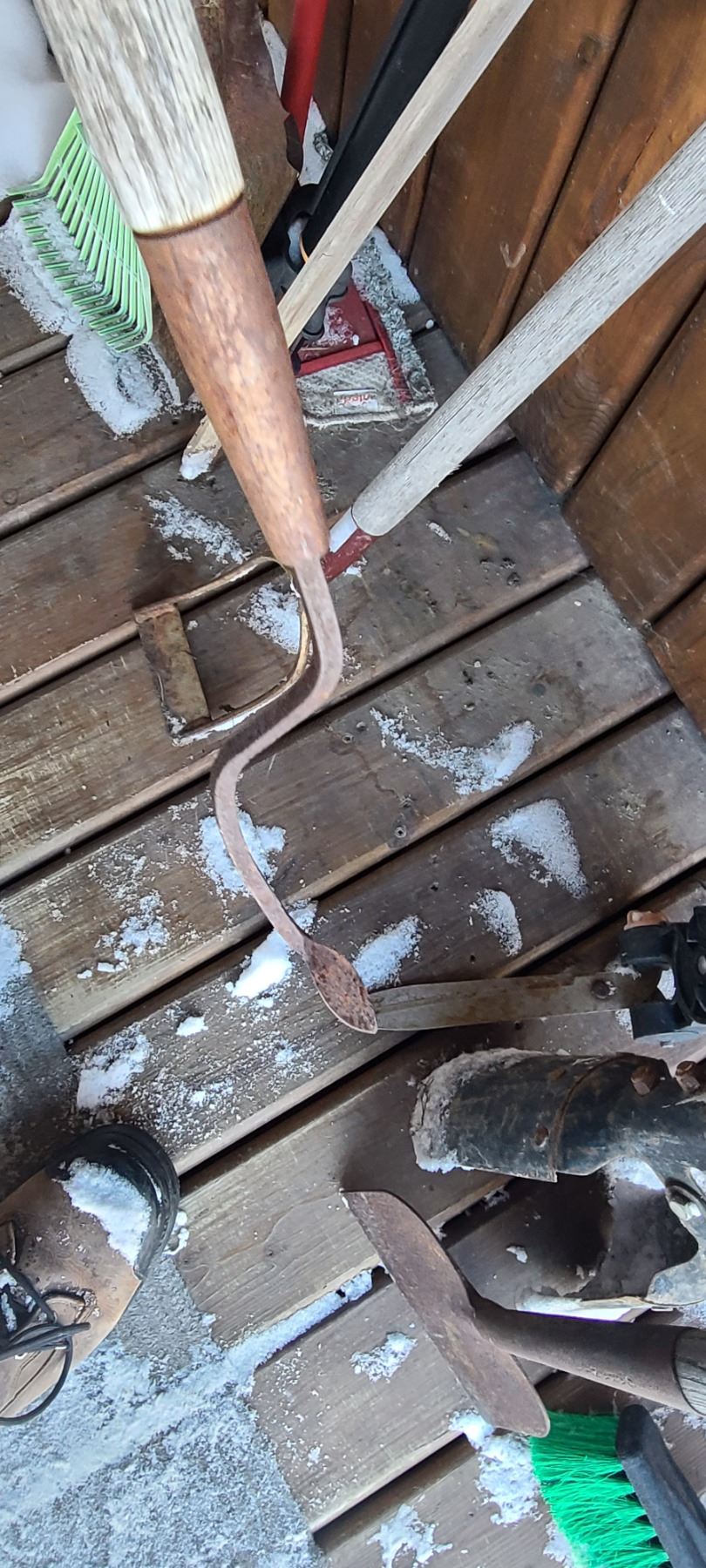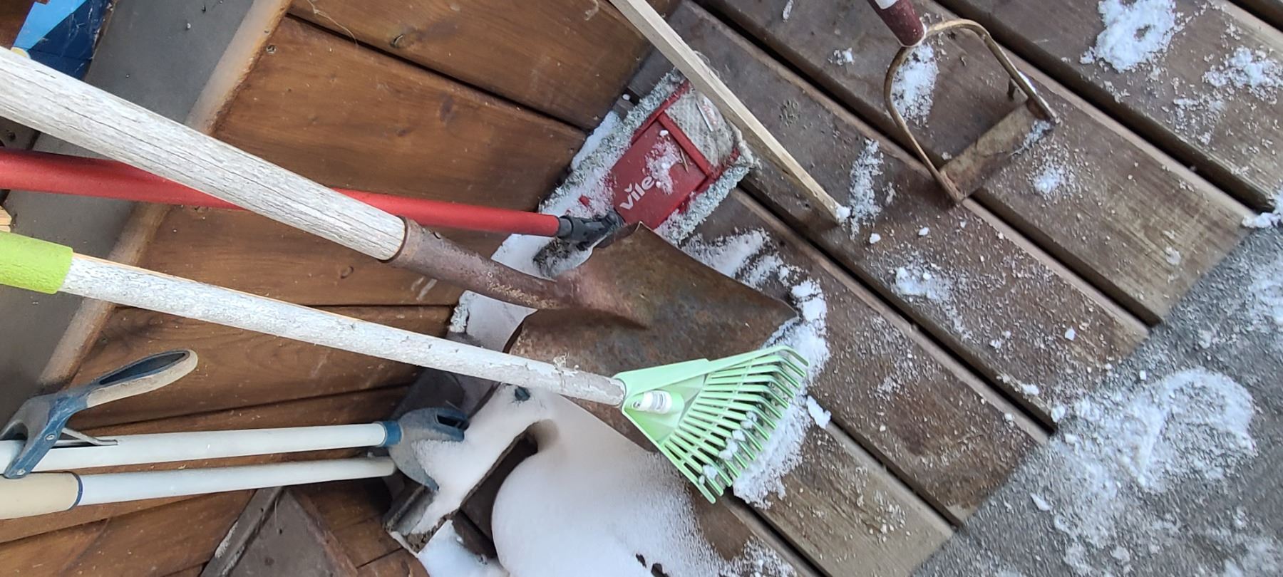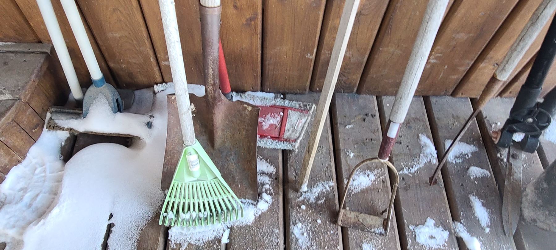 ALL GARDEN TOOLS, SHOVELS, ICE PICKS, AND 2 WHEEL DOLLY IN PHOTO