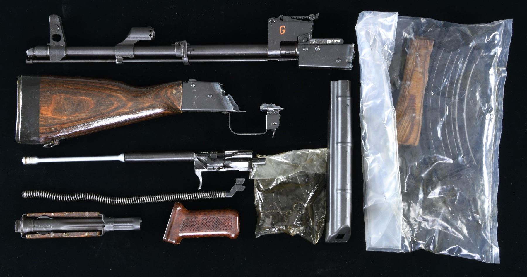 MACHINE GUN PARTS KIT. PM63 (AKM) machine gun parts kit mfg. in Romania at the Cugir arsenal in 1986. The "G Series" PD63s, were mfg. by Romania in the 1980s for issue to the Romanian Patriotic Guard, as tensions with the Soviet Union grew. This example (marked "G" on the left side of the rear sight block) is a complete parts kit, consisting of a bbl., slant AKM pattern brake, wood buttstock (with distinctive painted black band at rear), wood lower handguard, brown bakelite pistol grip, receiver cover, op rod, bolt carrier, bolt, recoil spring, selector lever, trigger parts, as well as 1 30-rd. mag. All serialized parts are matching (S# BX1978) and include the trunnion, gas tube, receiver cover, bolt carrier, and bolt. CONDITION: very good, with parts retaining a layer of grease, some areas of wear and thinning, as well as scattered superficial marks from handling and storage. Mirror chrome lined bore, retaining well defined rifling throughout. Wood furniture shows some superficial marks and minor impressions from handling and storage, but otherwise remains sturdy and serviceable. An attractive and complete parts kit for a Romanian "G Series" PM63 machine gun. PROVENANCE: From the Estate of Ivan Lee Shapiro. (02-23474-3/MLW). $400-800.