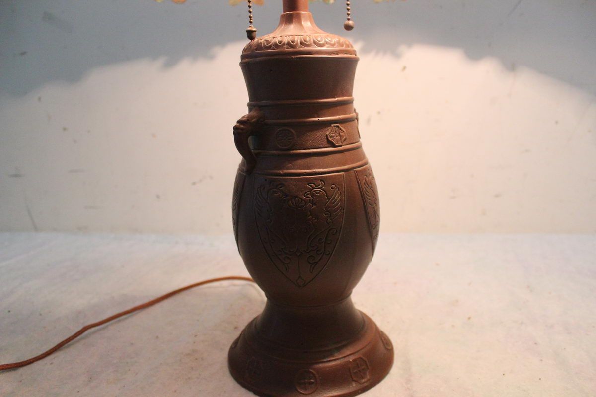 ALL ORIG. GREAT REVERSE PAINTED 8 PANEL SLAG GLASS LAMP W/ RIBBED GLASS AND ORNATE METAL BASE