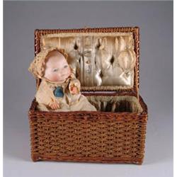 ALL ORIGINAL 8” BYE-LO BABY. A neat item for the collector. This tiny Bye-Lo Baby with blue glass sleep eyes is on a cloth body, and comes with original pin and tagged Bye-Lo dress, being contained in a wicker basket that is silk lined. CONDITION: JL 1-2195
