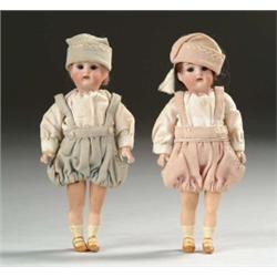 ALL-ORIGINAL K*R 6 1/2” K*R BOY & GIRL WALKERS.  A great pair of tiny K*R dolls in original clothing with five-piece jointed composition bodies, the young man and young lady both feature brown glass sleep eyes and matching pink and blue outfits.  Marked on rear and head “K*R.”  SIZE:  6 1/2” t.  CONDITION:  Near mint condition, some fading to outfits.  JL 1-4525 (300-400)