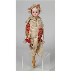 Lot # 121 ALL ORIGINAL MUSICAL MARROTTE. Bisque head marked "Germany 6/0". Blue set eyes, open mouth with four teeth. Blonde caracal wig. The clothing is a printed velvet and satin mix highlighted with lace fabric balls. SIZE: 13" l/ overall. CONDITION: Near mint and in working order. 1-29065 (400-600)