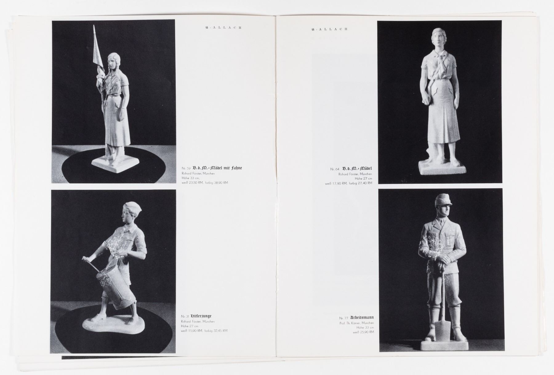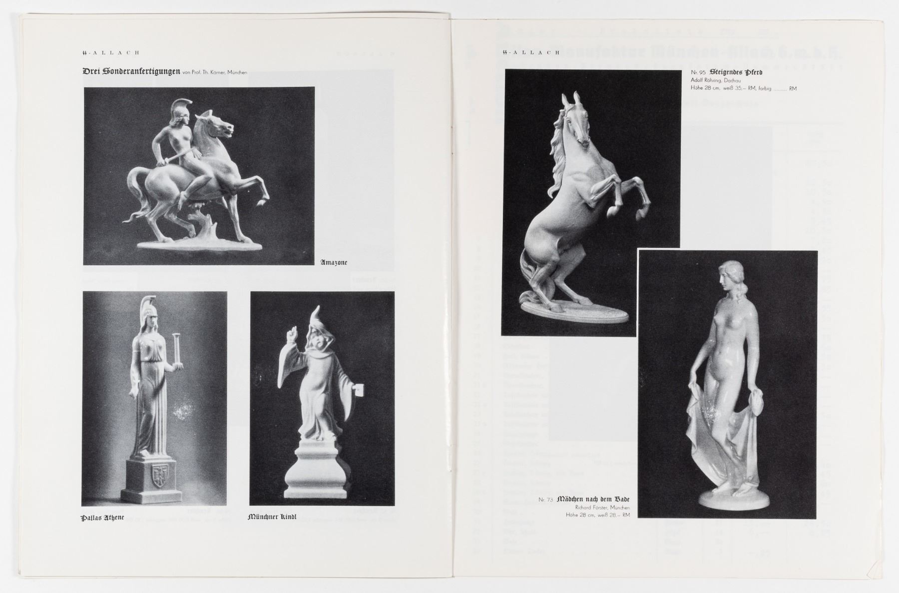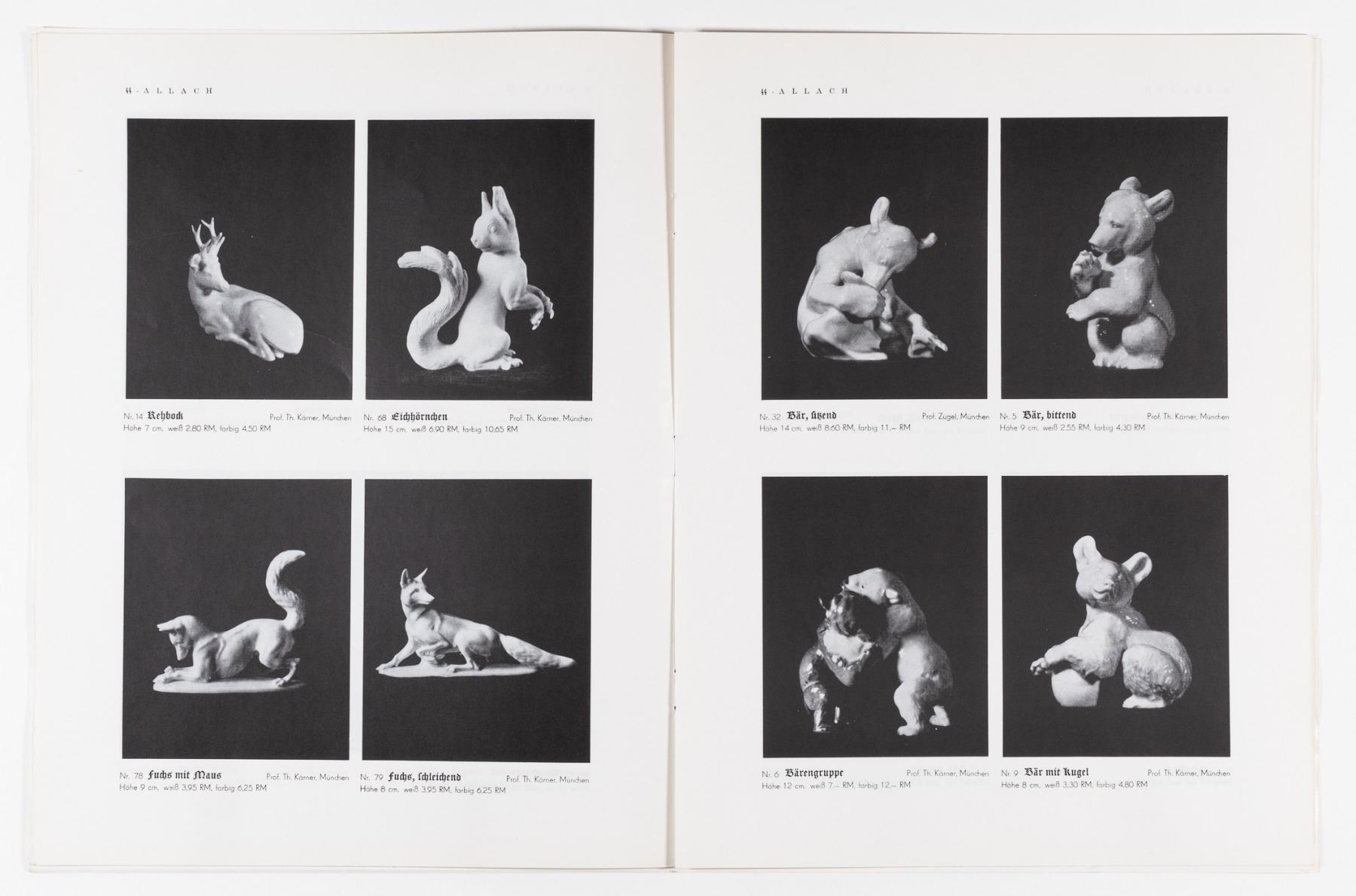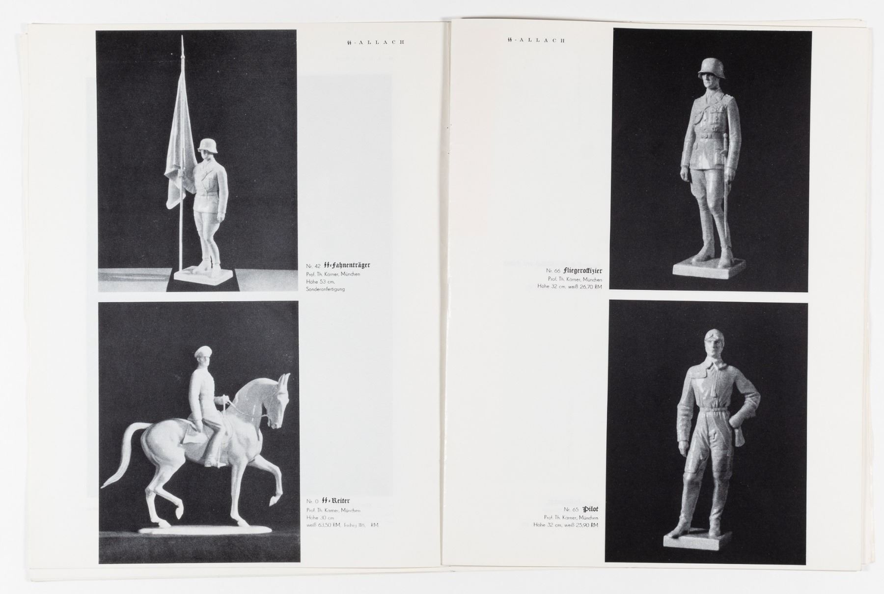 Reprint of the scarce original SS-Allach catalog, Porzellan-Manufaktur Allach 1938-1939, approx. 48 pages, partially disbound. The catalog features b/w photographs and prices of porcelain sculptures manufactured by Allach. 11 x 8.5 inches.