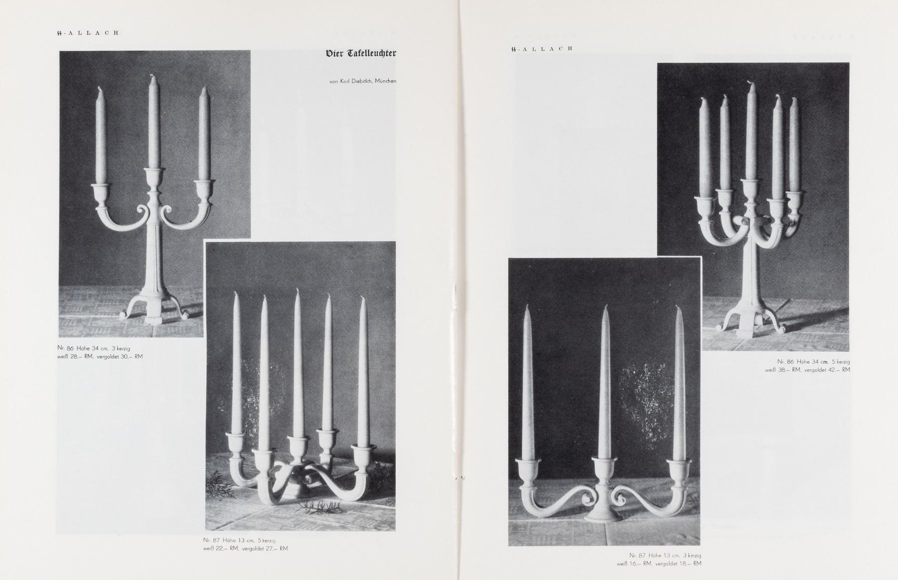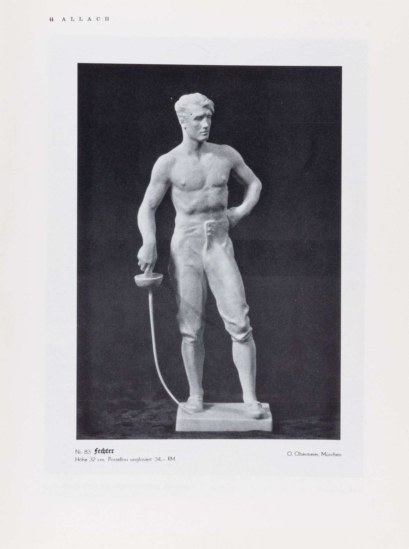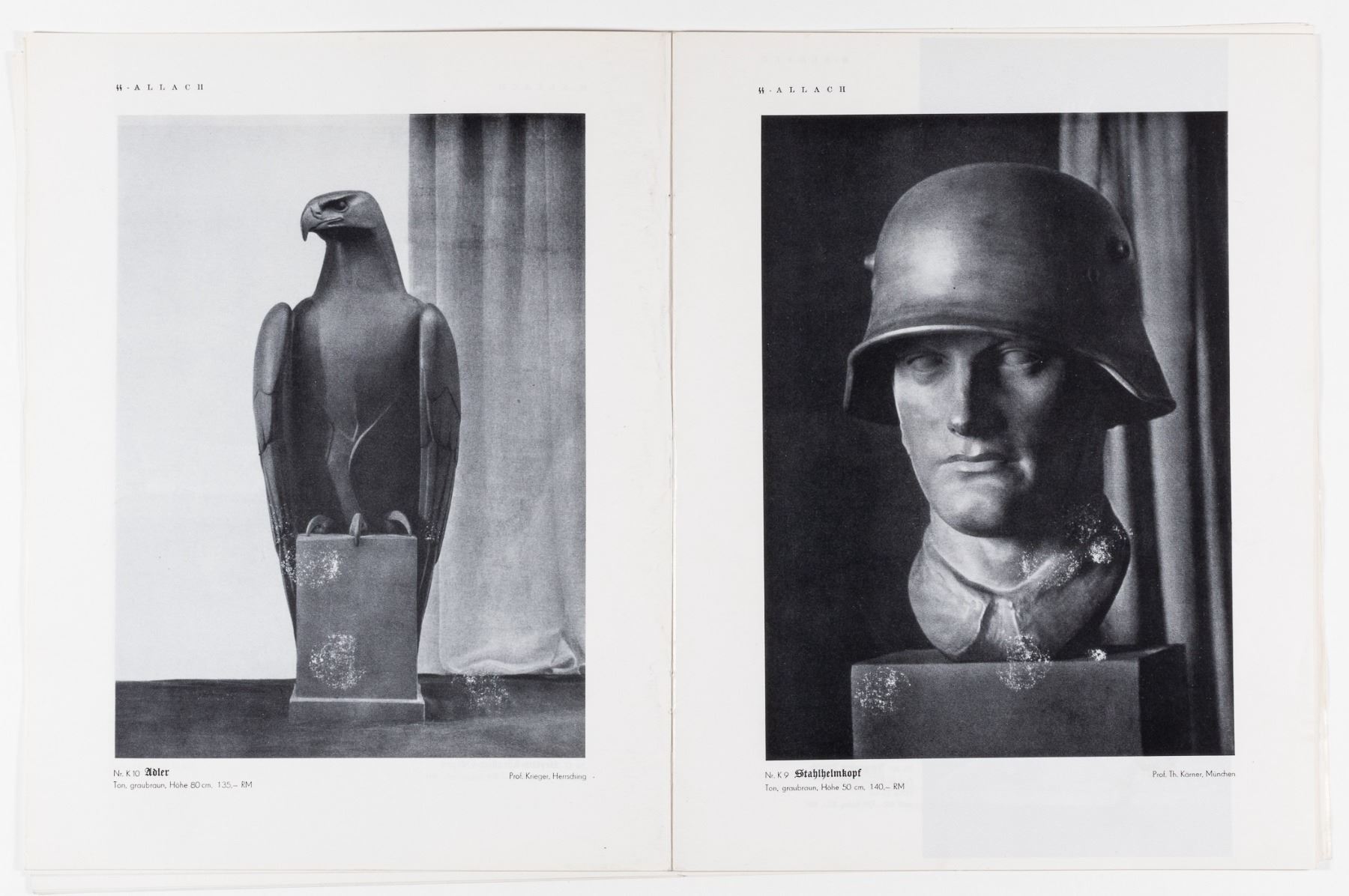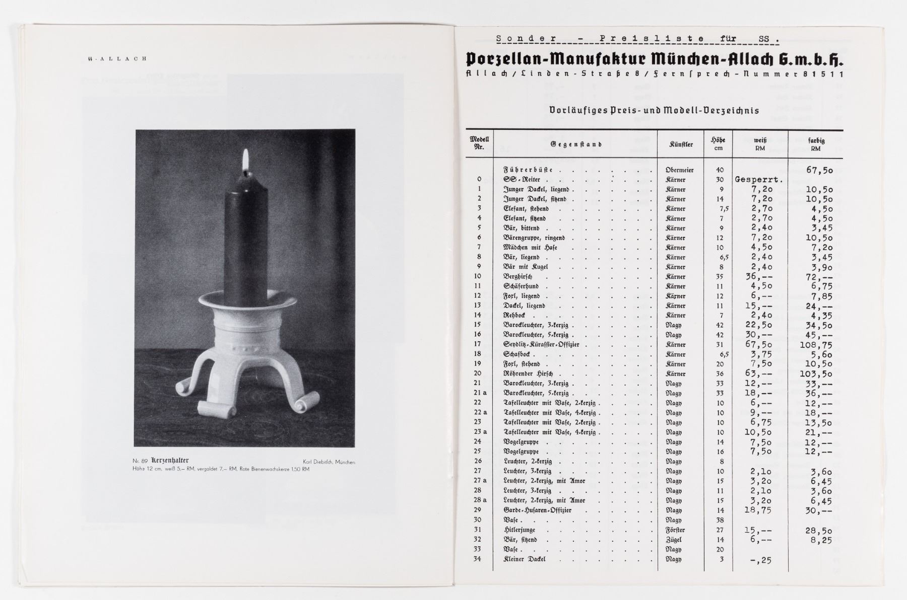 Reprint of the scarce original SS-Allach catalog, Porzellan-Manufaktur Allach 1938-1939, approx. 48 pages, partially disbound. The catalog features b/w photographs and prices of porcelain sculptures manufactured by Allach. 11 x 8.5 inches.