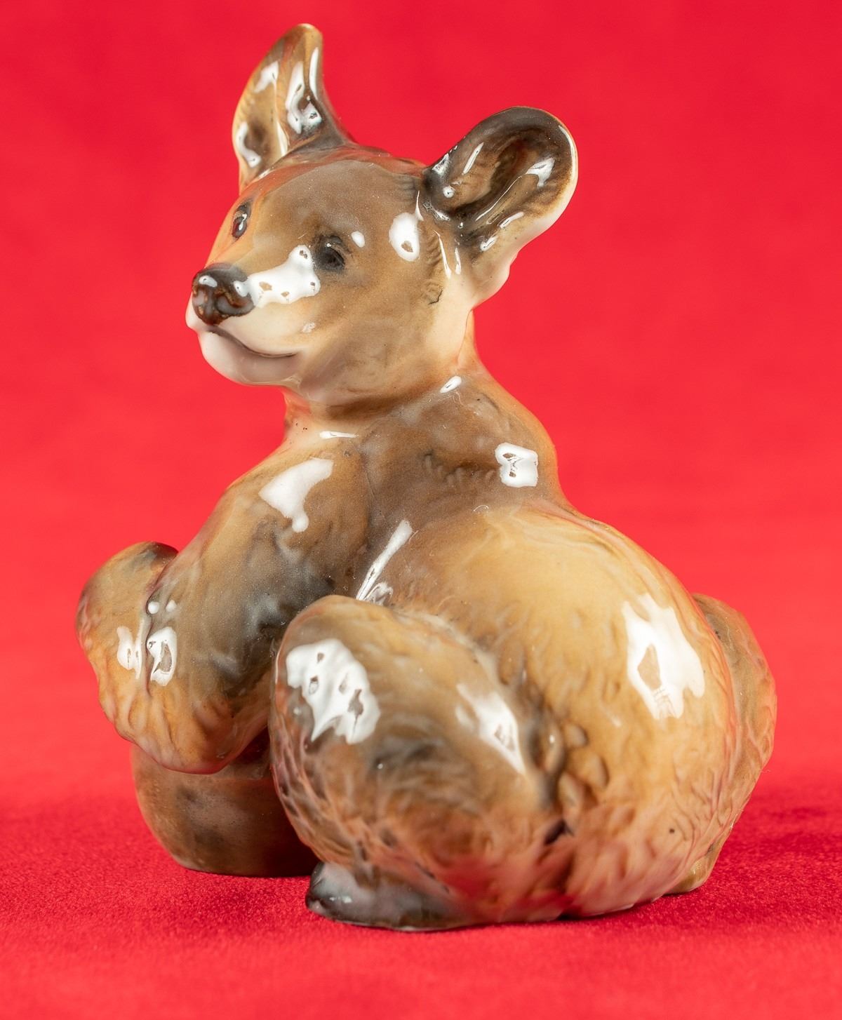 Allach porcelain painted bear with ball, model number 9, designed by Professor Theodor Kaerner. Circa 3.25 inches tall, 2.2.25 inches wide and 3 inches long, in excellent condition. Marked with green SS runes on the underside and debossed with the model number and Prof. Kaerner's name.