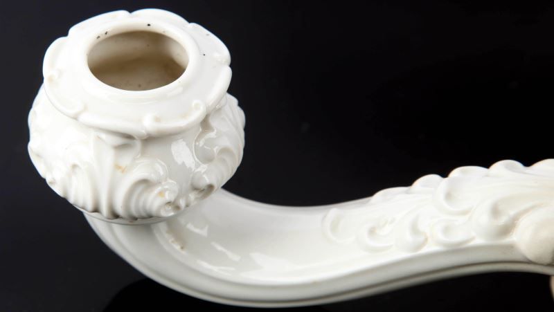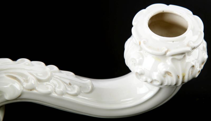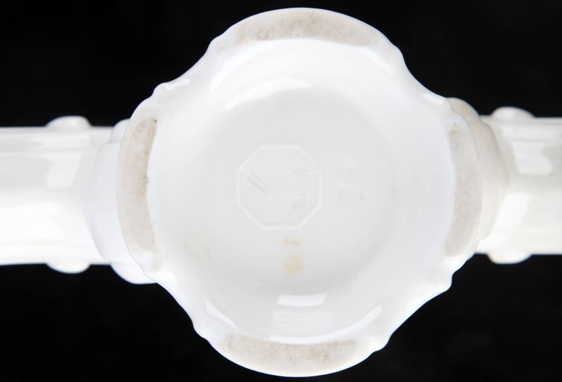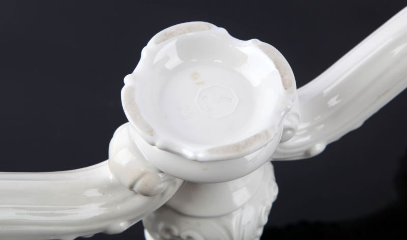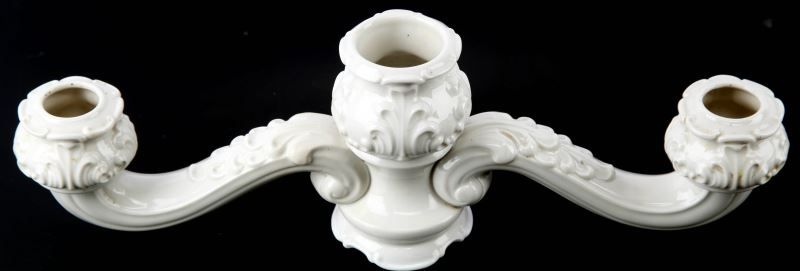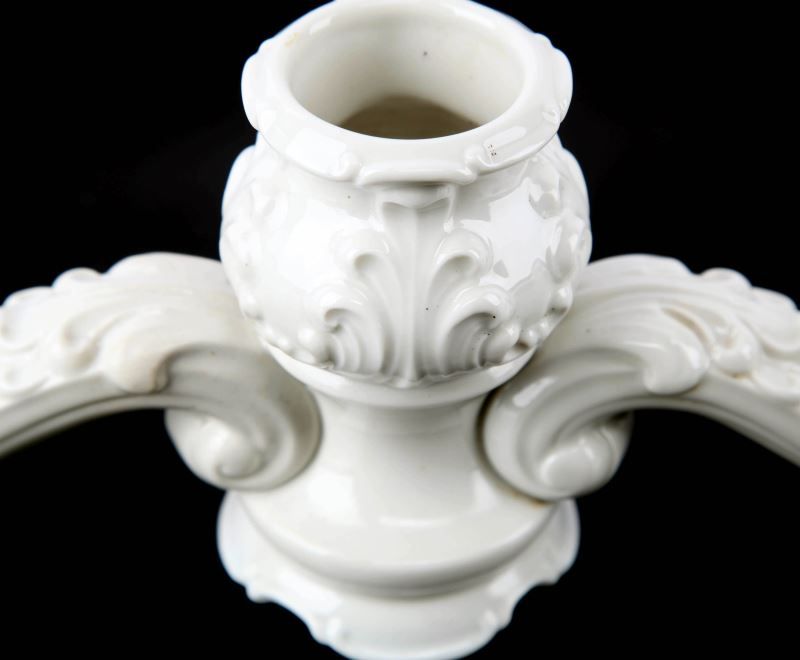 This candelabra appears on page 205 of David R. Porell's book "Allach Porcelain 1936-45", a copy of the page is included, the description reads in part. "The rare white glazed porcelain Barock Tafelleuchter branch 2 Candle baroque table Candelabra Model #23 by Franz Nagy. Known production numbers indicate there were 69 white versions". extremely low production, free of damage flaws or detractions, Allach Runic mark on base, 4 inches in height.