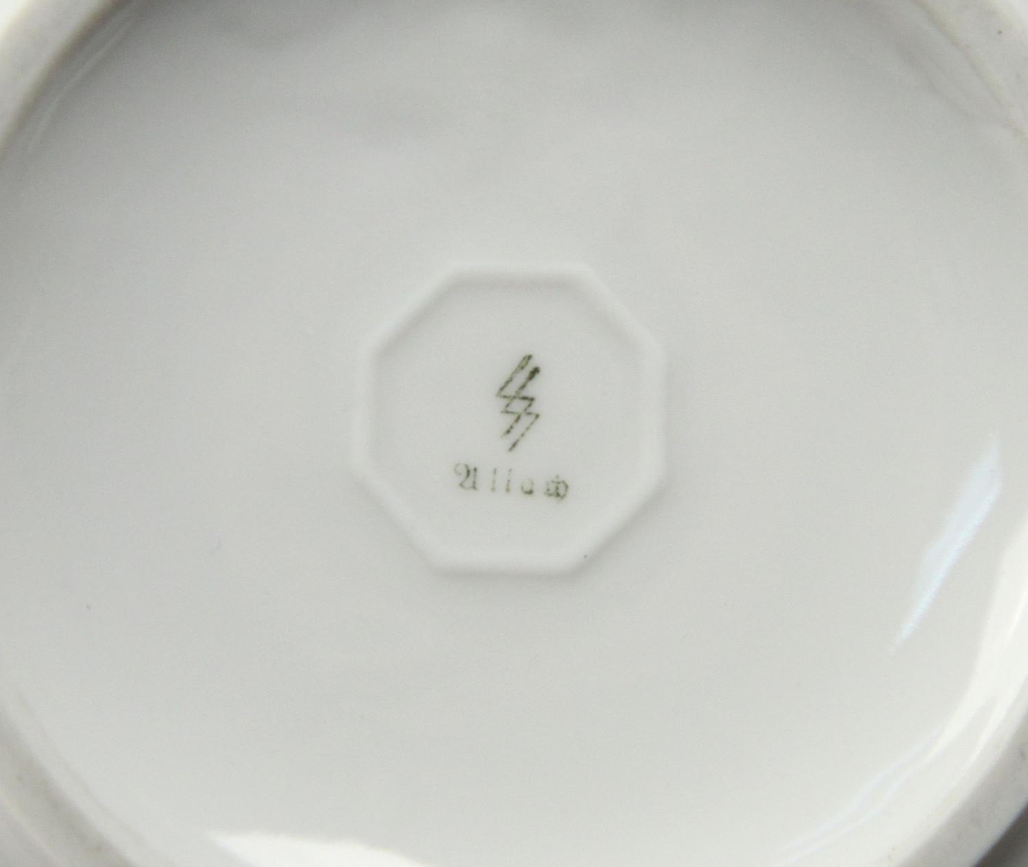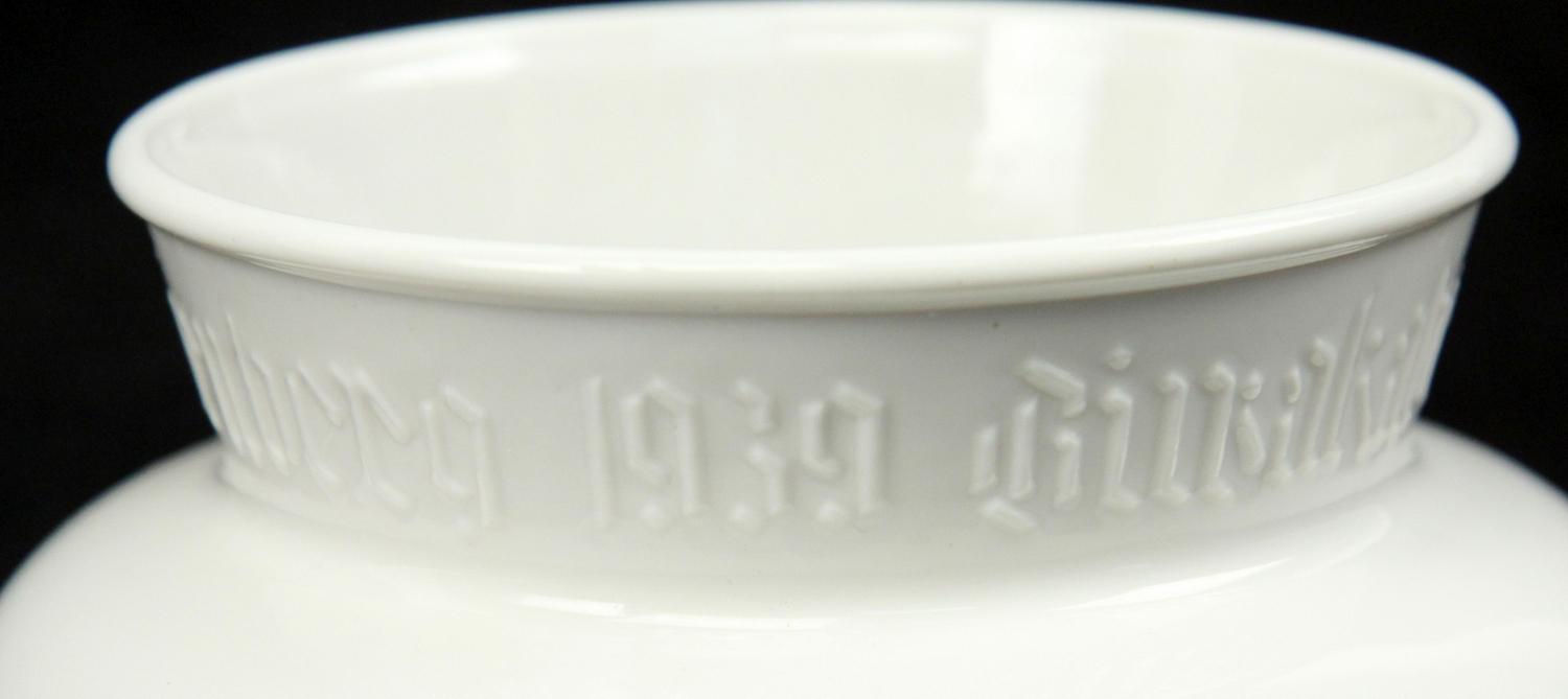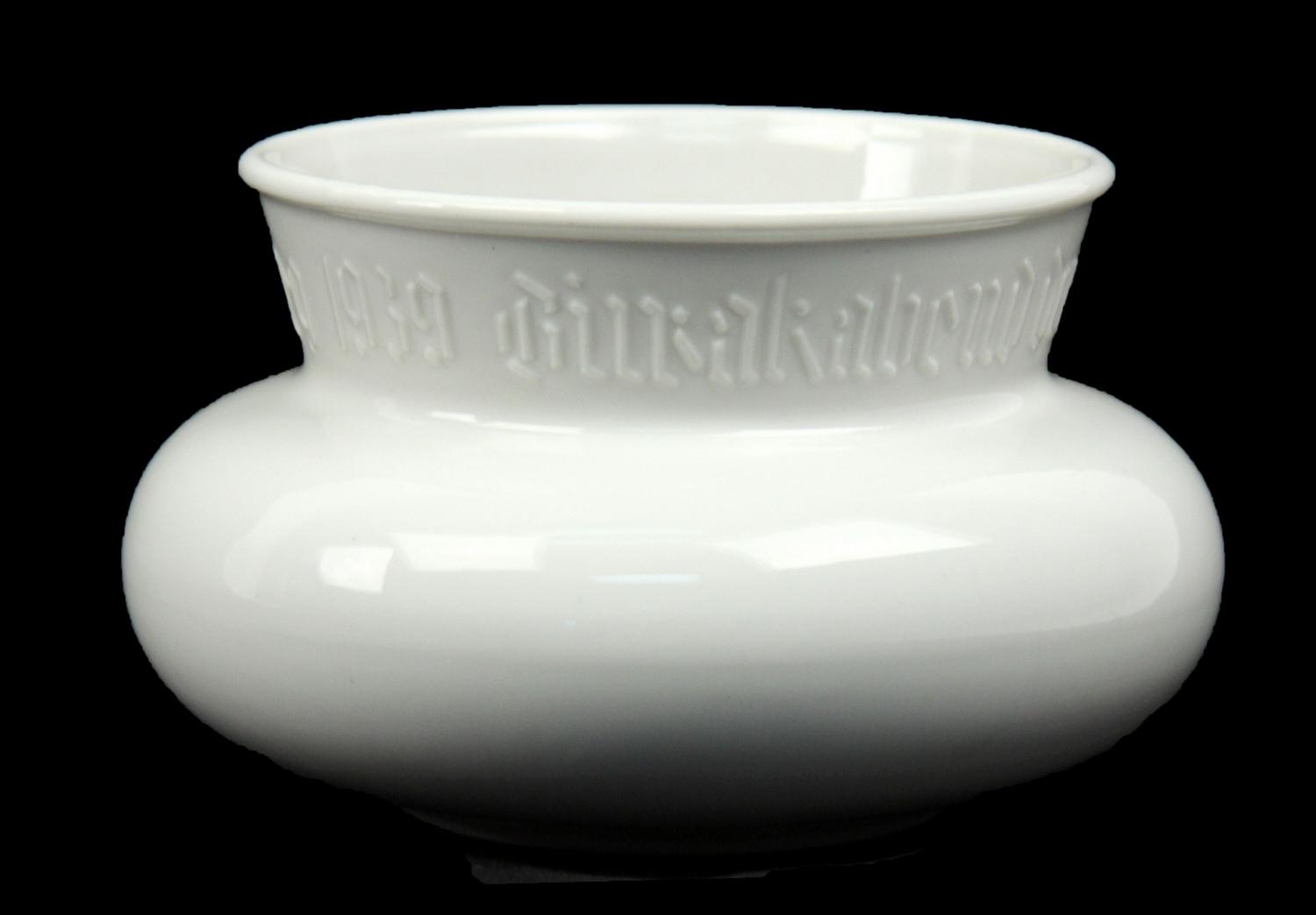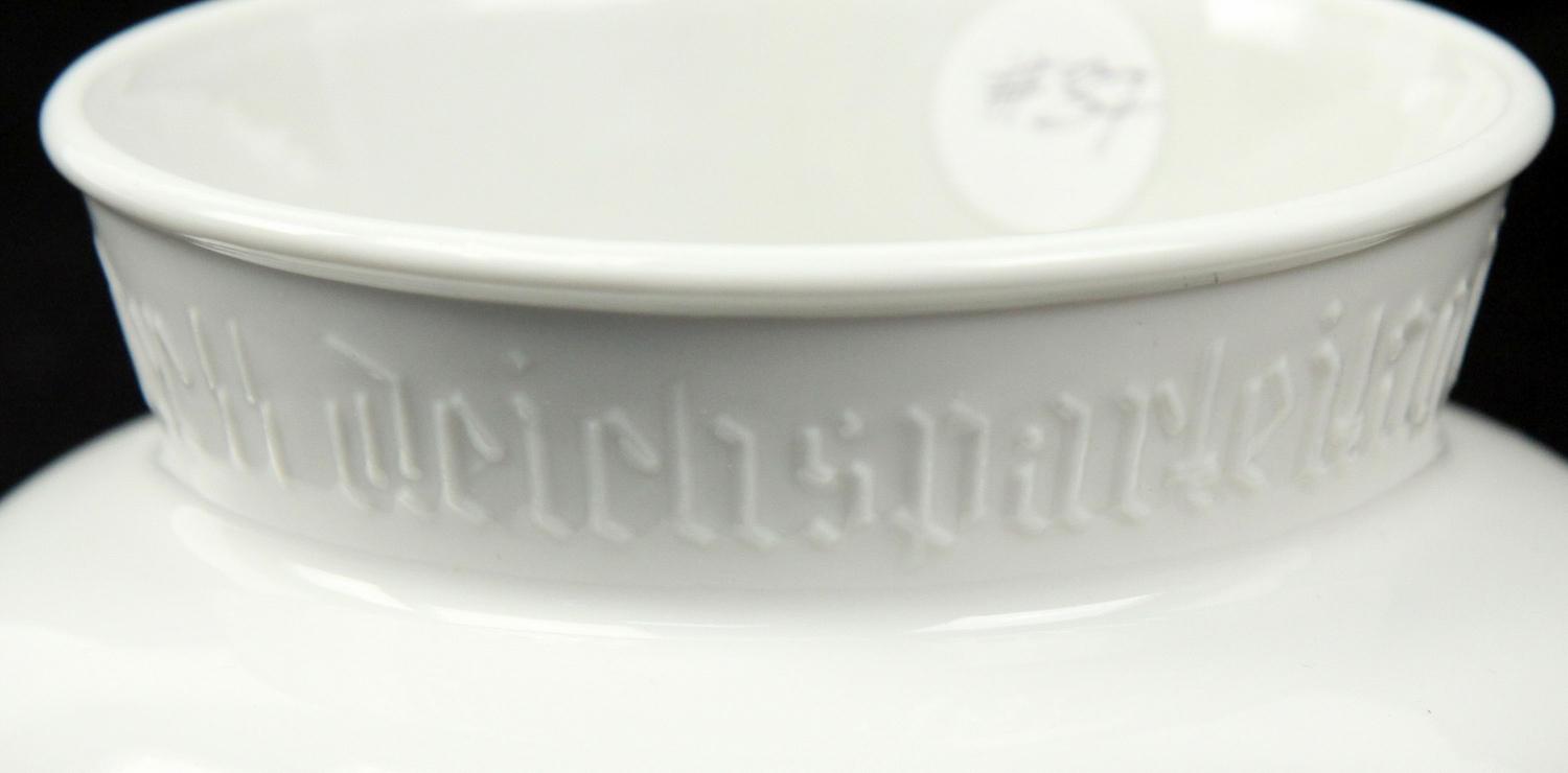 A Allach SS pottery bowl embossed rim loosely translated Government Party Day Nuremburg 1939, measuring 3x5 inches, excellent condition.