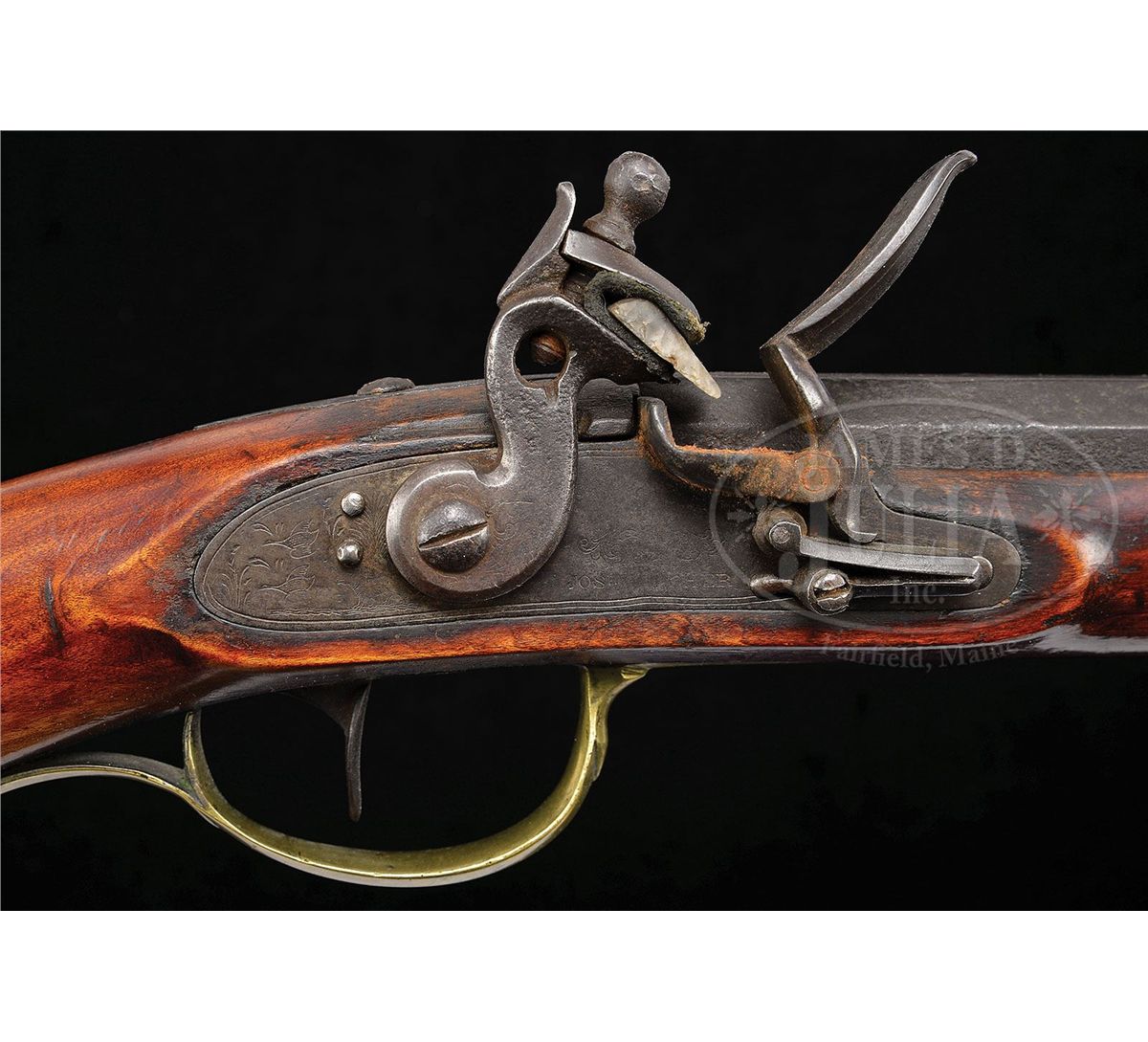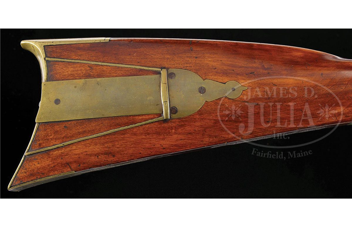 NSN. Cal. .36 rifled. Rifle has a 39-1/2" full oct unsigned rifled barrel. Bbl tang is of the traditional Hess design. Rifle has a Josh Golcher flintlock and a typical Hess family 4-piece brass patchbox. Arrow back toe plate is typical of Lehigh County guns. PROVENANCE: Collection of Woody Frey. CONDITION: Rifle is in extremely fine condition throughout. 4-48498 RG15