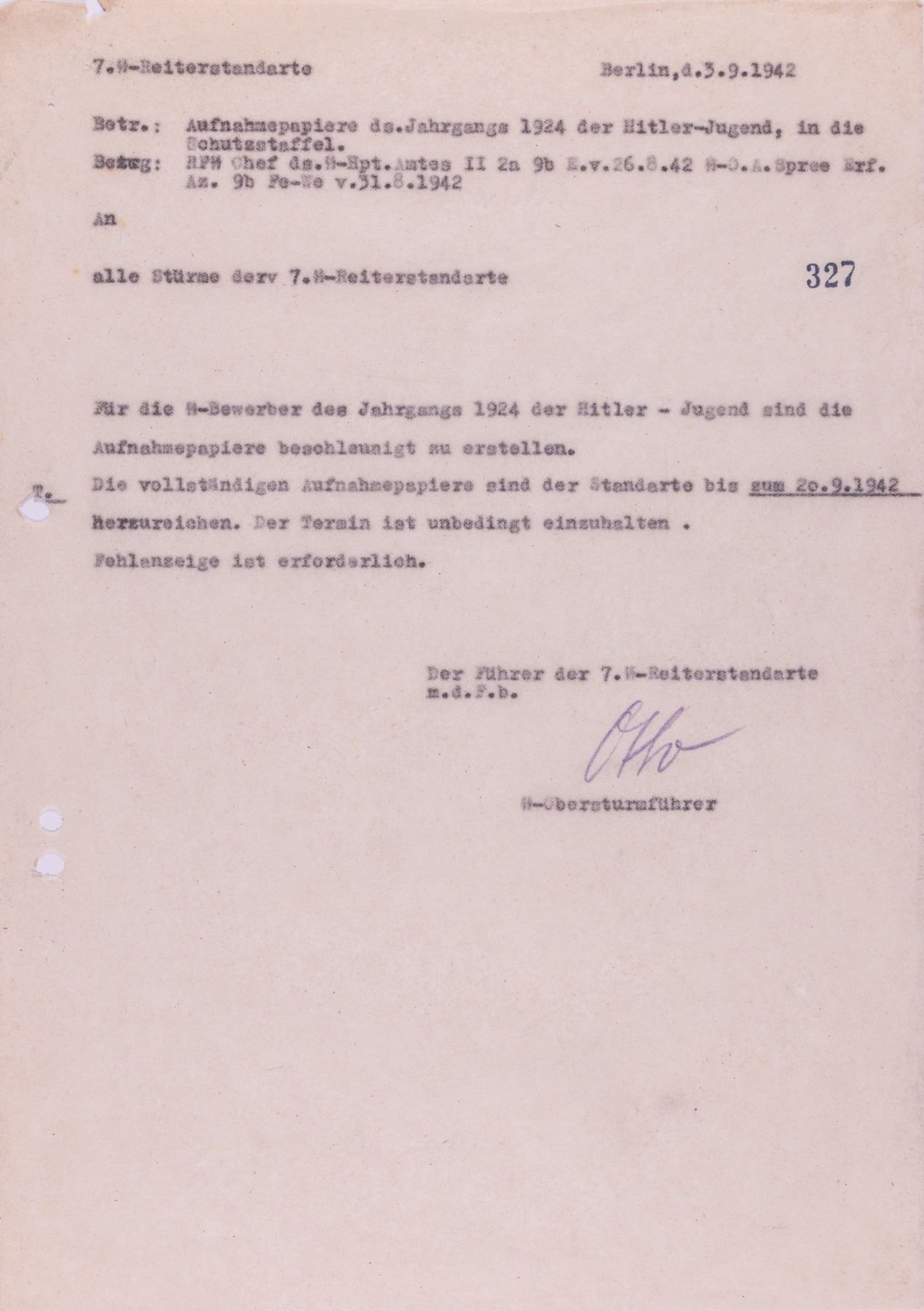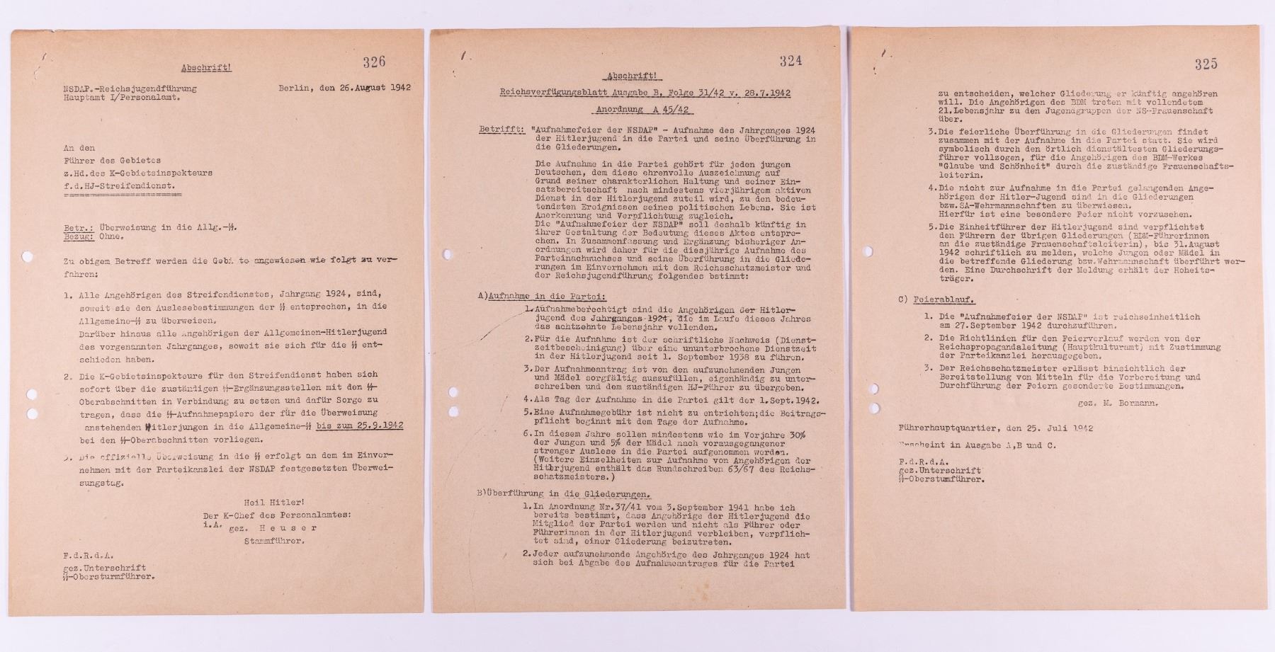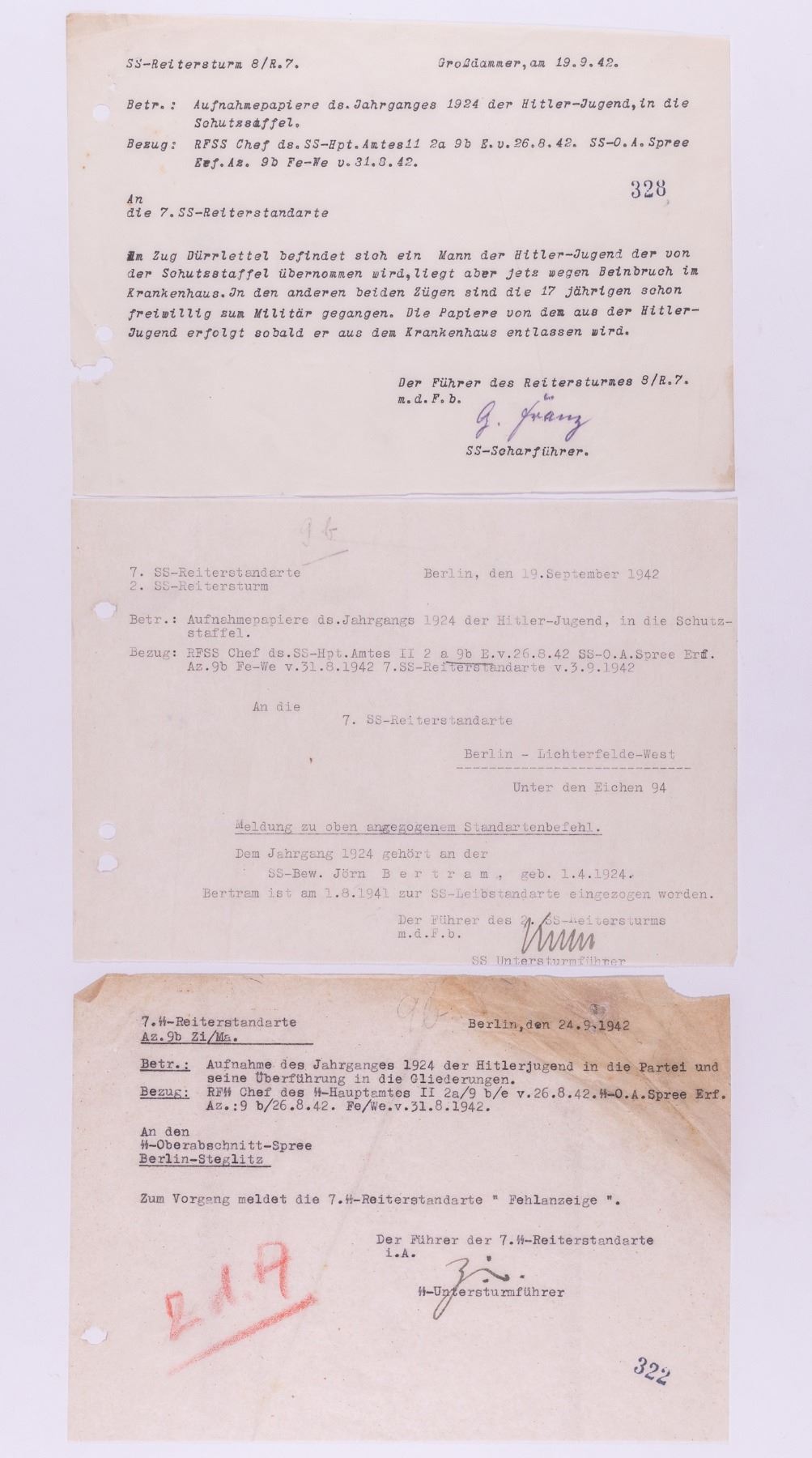 Group of eleven documents, briefs between the 7. SS-Reiterstandarte, Reichsfuhrer SS-HA (Gottlob Berger) and SS-Oberabschnitt Spree, concerning transfer of Hitler Youth members of the birth year 1924 into the Allgemeine-SS. With a photograph of an NSKK-member; a 1937 contribution receipt from the NSDAP, Munich; and a rejection letter from the Gauleitung NSDAP Weser-Ems from 1934 concerning two non-conforming citizens. Eleven pieces.