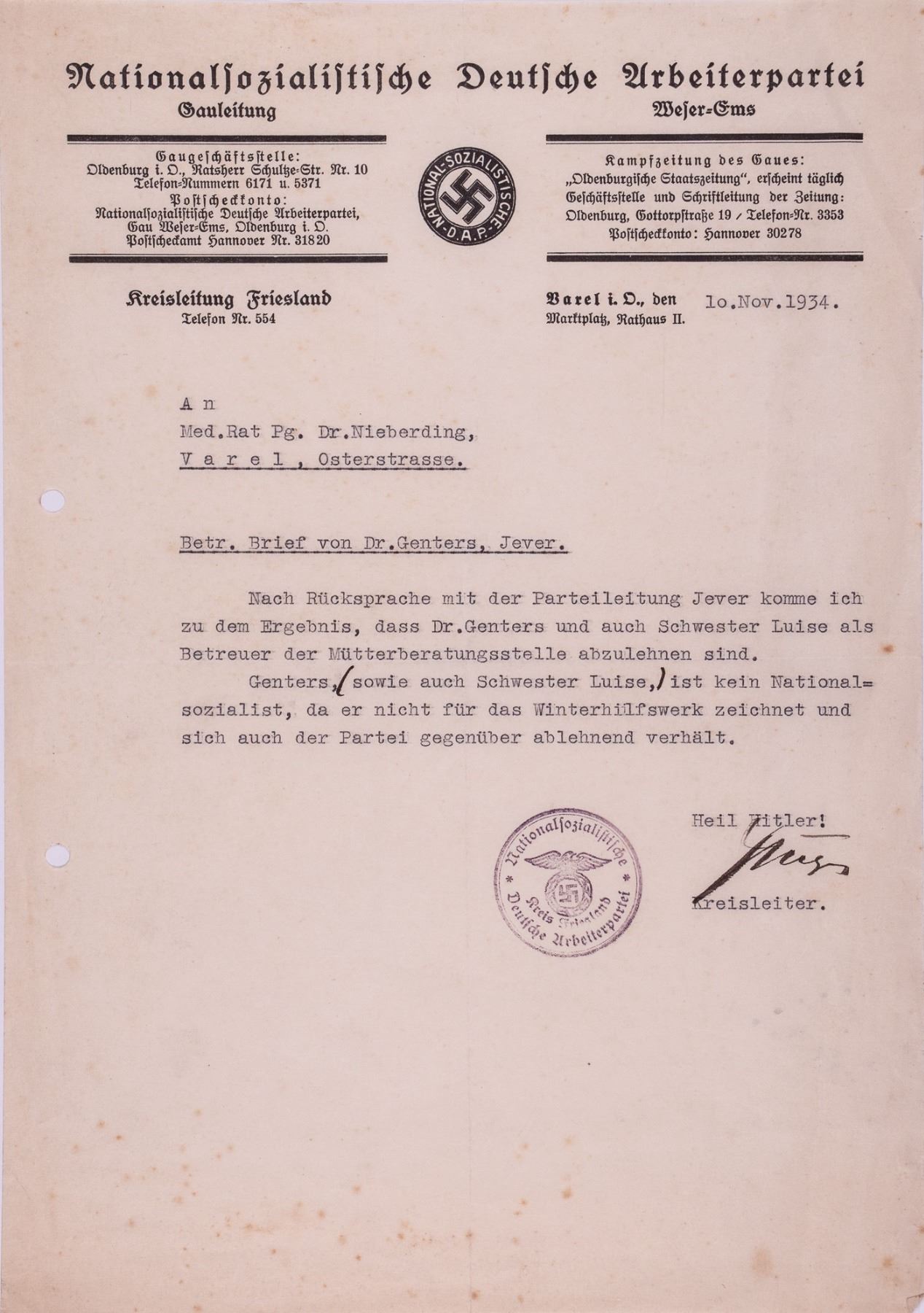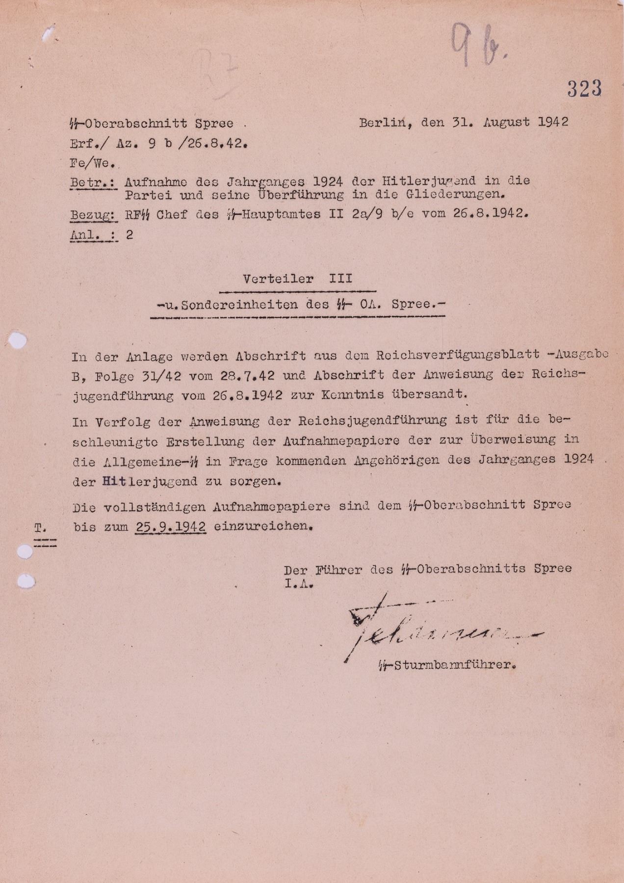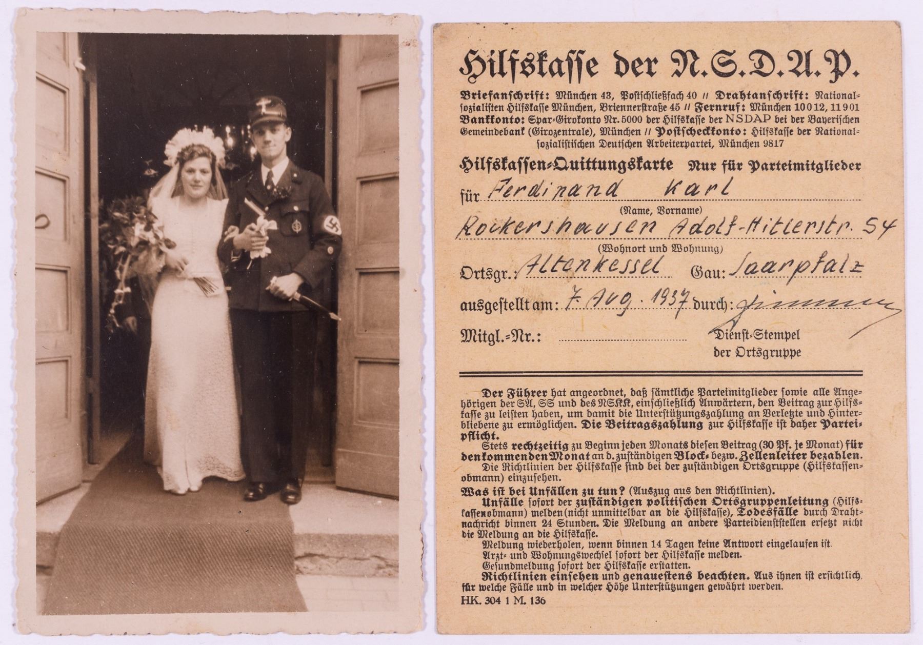 Group of eleven documents, briefs between the 7. SS-Reiterstandarte, Reichsfuhrer SS-HA (Gottlob Berger) and SS-Oberabschnitt Spree, concerning transfer of Hitler Youth members of the birth year 1924 into the Allgemeine-SS. With a photograph of an NSKK-member; a 1937 contribution receipt from the NSDAP, Munich; and a rejection letter from the Gauleitung NSDAP Weser-Ems from 1934 concerning two non-conforming citizens. Eleven pieces.