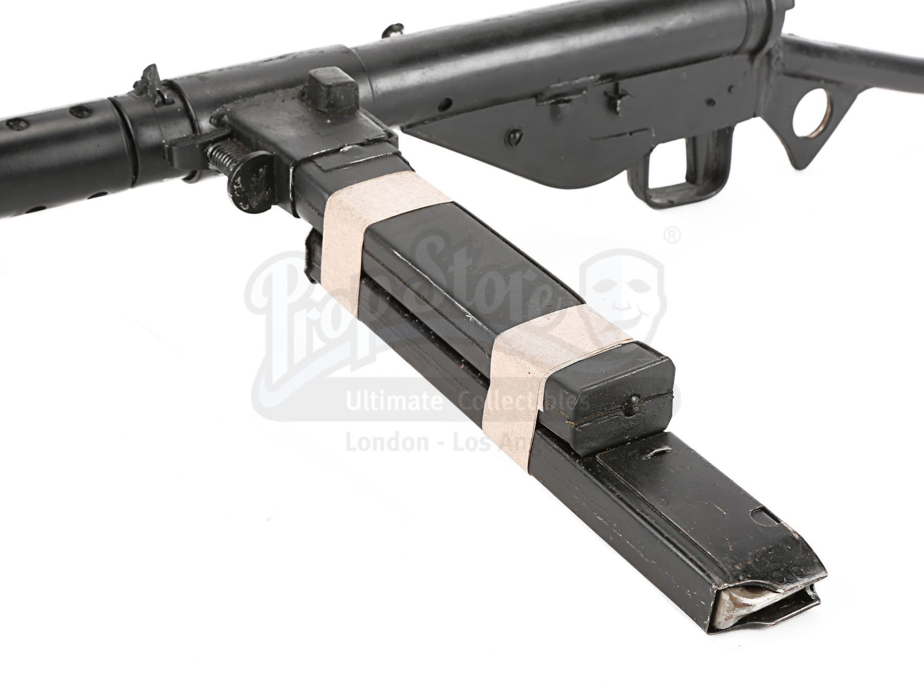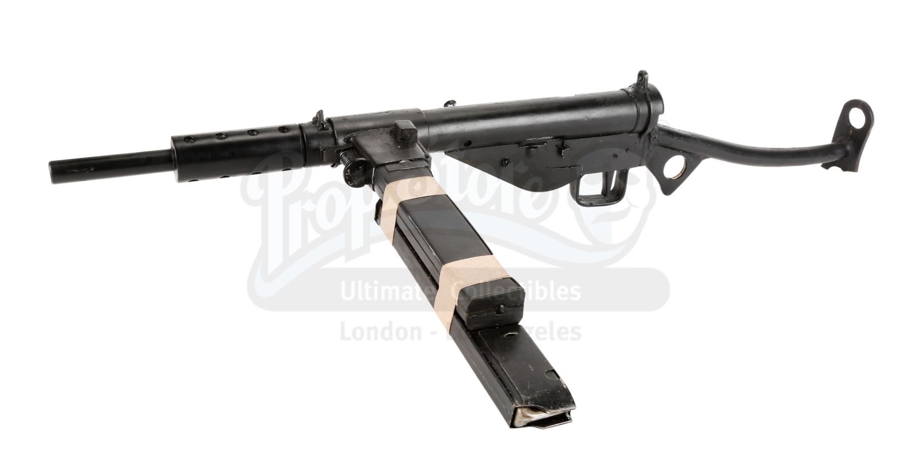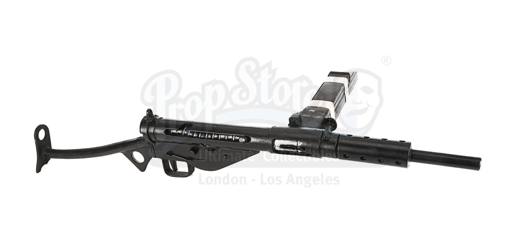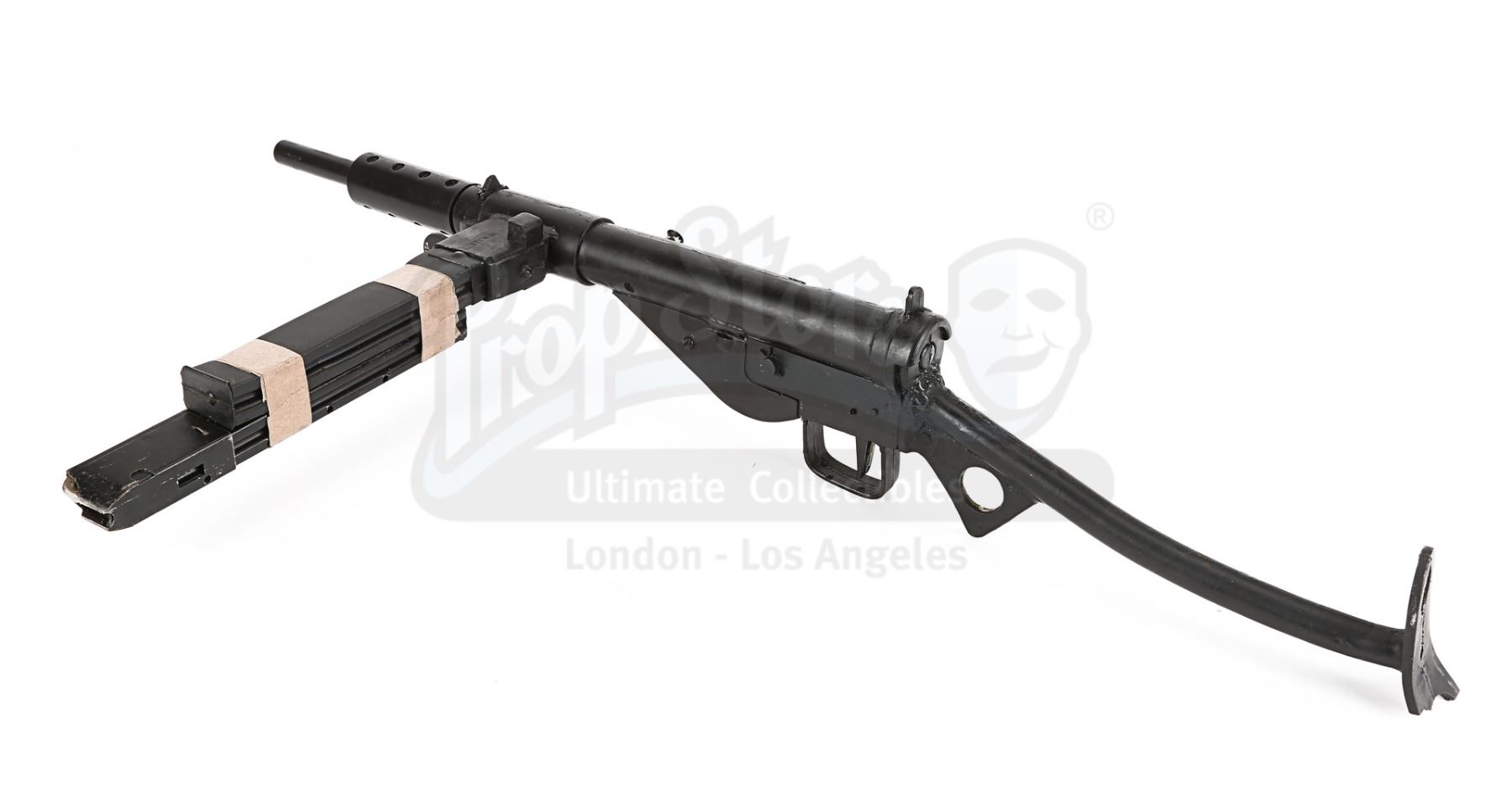 Max's (Brad Pitt) Sten submachine gun from Robert Zemeckis' war thriller Allied. Max used his gun to teach Marianne (Marion Cotillard) how to shoot, and later wielded it during the mission to assassinate the German ambassador (Anton Blake). The gun is a stunt version of a Sten Mk II, made predominantly of rubber, with a metal armature. The weapon has two magazines - one made of metal, one of rubber - strapped together with tape, allowing Max to reload more quickly and easily. The piece has some wear from production use, including scuffing and scratches, and part of the butt of the gun has come away. Dimensions: 79 cm x 35 cm x 20 cm (13" x 3 3/4" x 9")