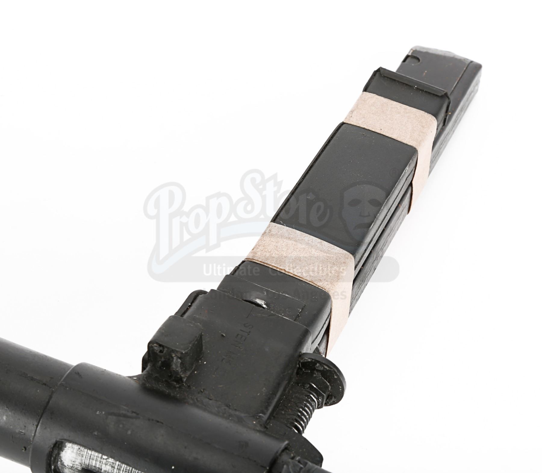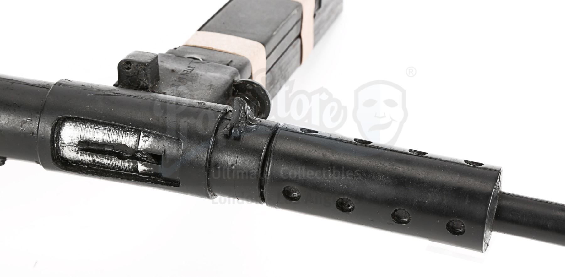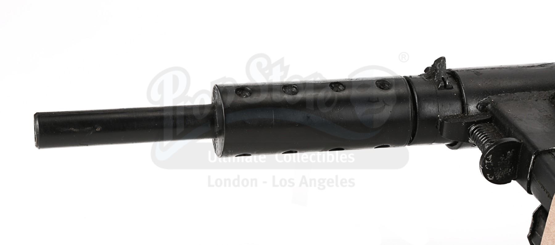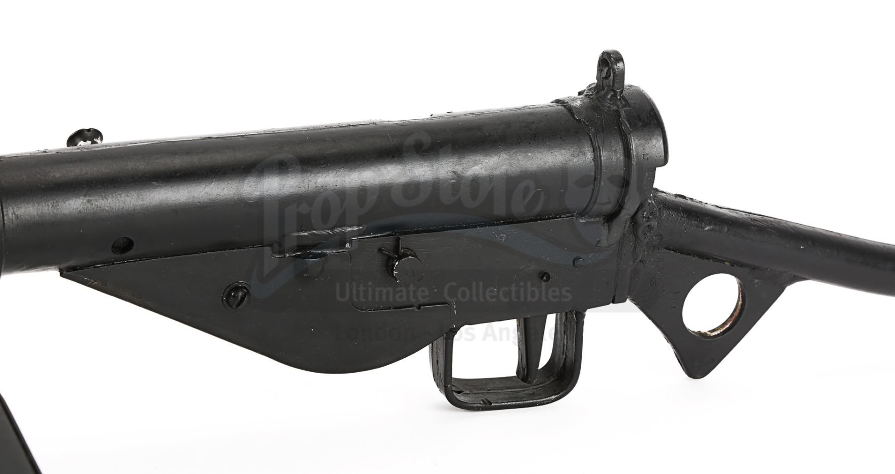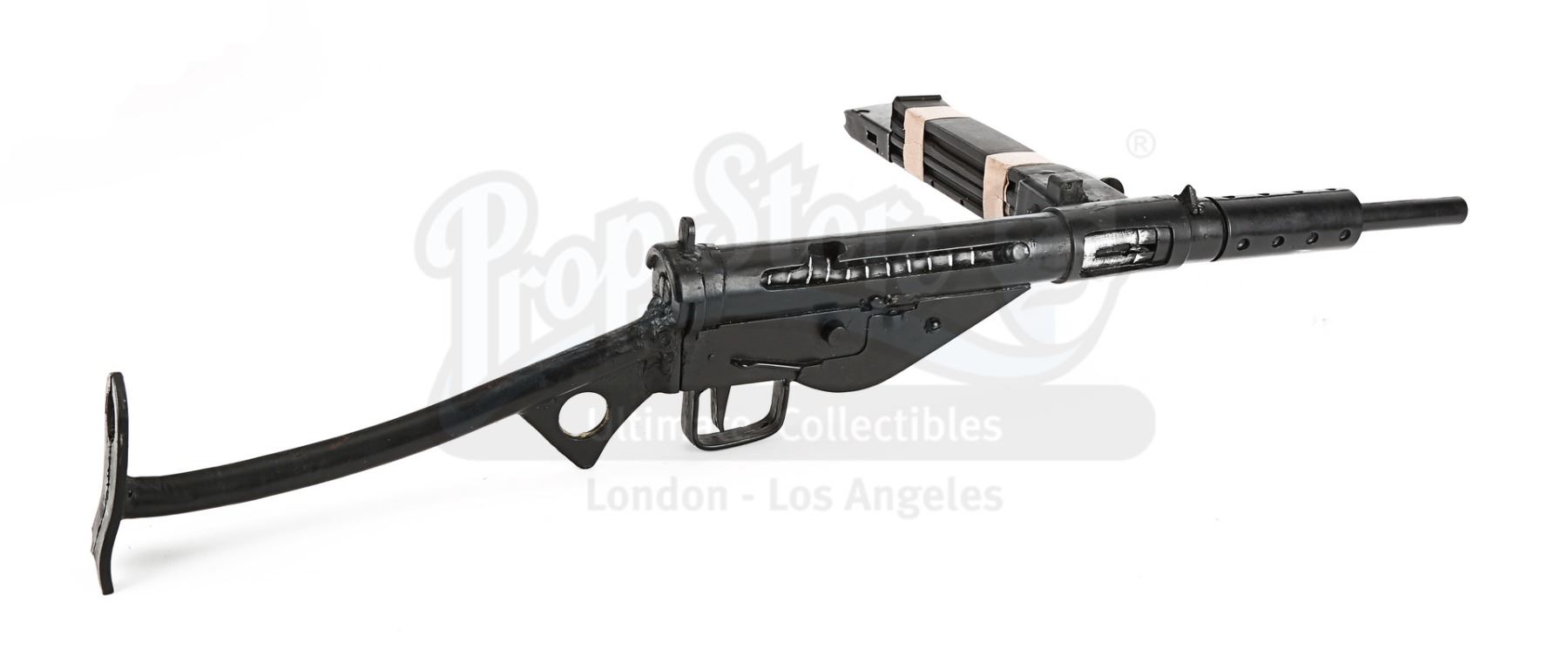 Max's (Brad Pitt) Sten submachine gun from Robert Zemeckis' war thriller Allied. Max used his gun to teach Marianne (Marion Cotillard) how to shoot, and later wielded it during the mission to assassinate the German ambassador (Anton Blake). The gun is a stunt version of a Sten Mk II, made predominantly of rubber, with a metal armature. The weapon has two magazines - one made of metal, one of rubber - strapped together with tape, allowing Max to reload more quickly and easily. The piece has some wear from production use, including scuffing and scratches, and part of the butt of the gun has come away. Dimensions: 79 cm x 35 cm x 20 cm (13" x 3 3/4" x 9")