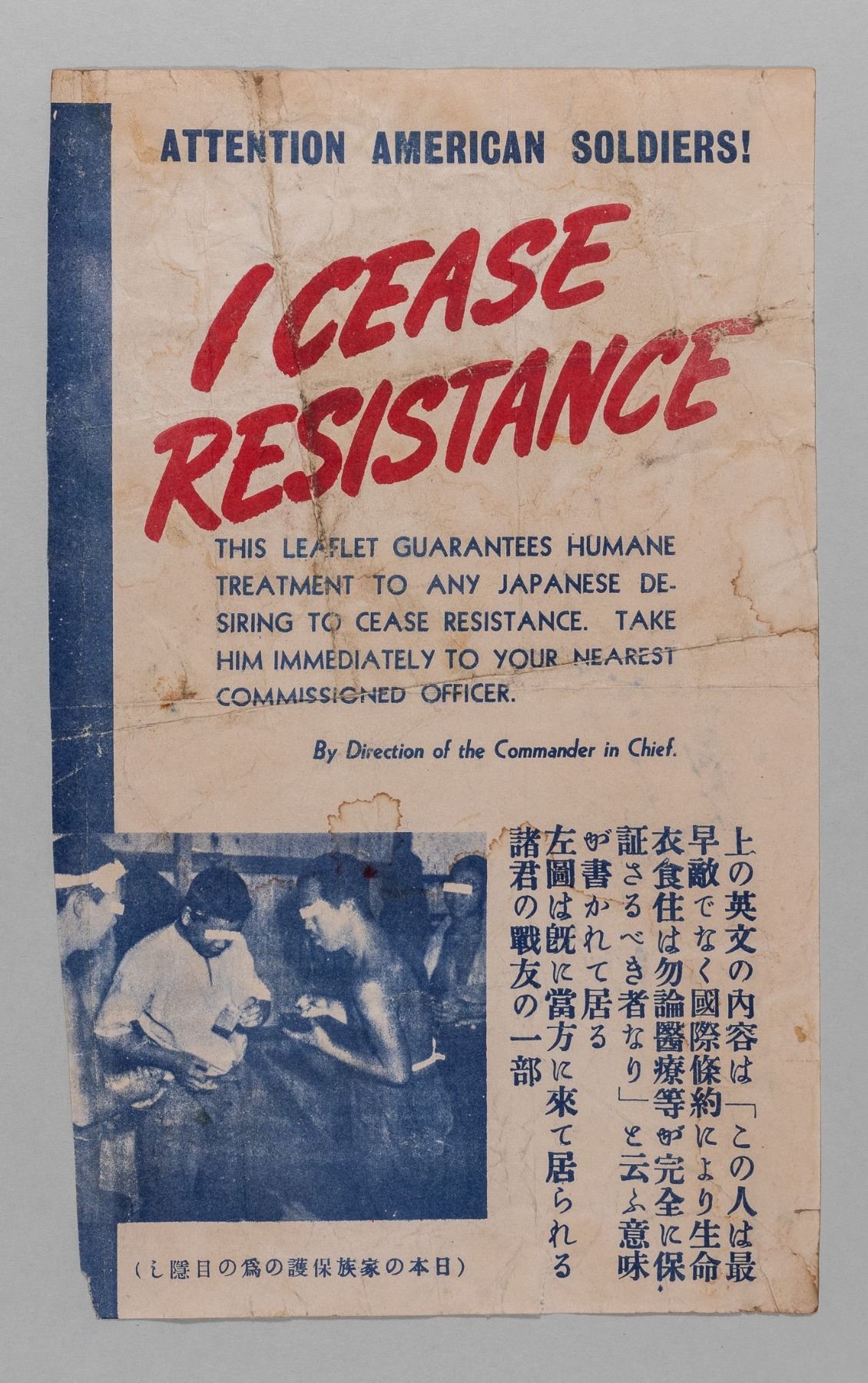 American propaganda leaflets dropped on Japanese soldiers during WWII encouraging Japanese soldiers to surrender, approx. 11 x 6.75 inches. The leaflets state that Japanese soldiers will be treated well if they surrender. The leaflet reads, 'This leaflet guarantees humane treatment to any Japanese desiring to cease resistance. Take him immediately to your nearest commissioned officer. By Direction of the Commander in Chief.' The leaflet has a printed picture of anonymous Japanese prisoners receiving medical aid. Horizontal folds, creases, minor tears, water damage, soiling, and minor loss of bottom left corner.