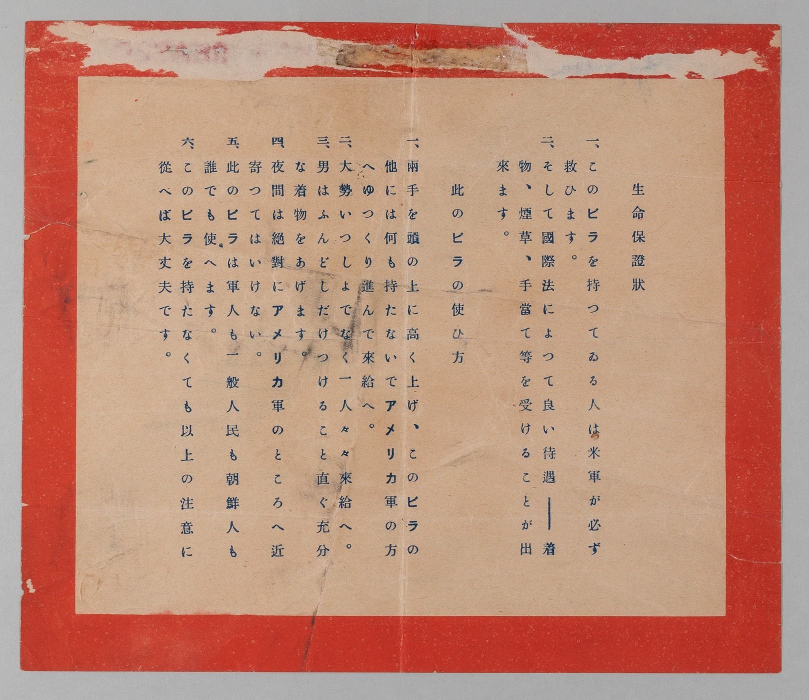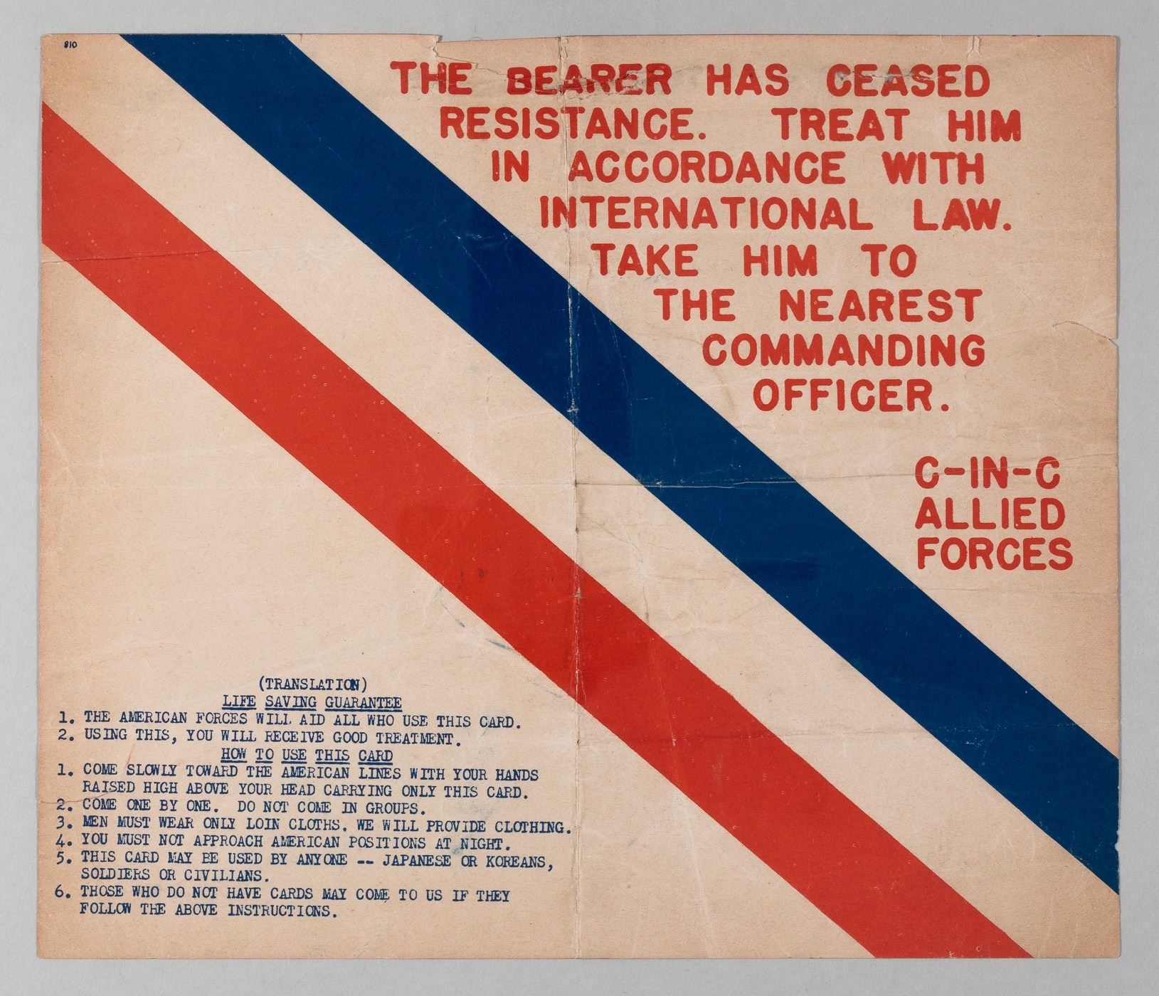 American propaganda leaflet dropped on Japanese soldiers during WWII encouraging Japanese soldiers to surrender. The leaflet states that Japanese soldiers will be treated well if they surrender. The leaflet reads, 'The bearer has ceased resistance. Treat him in accordance with international law. Take him to the nearest commanding officer. C.-in-C. Allied Forces.' Approx. 10.5 x 9 inches. Minor loss and abrasions at top edge, old adhesive at top edge, vertical fold, mailing folds, minor loss on edges, and 1-inch tear on right edge.