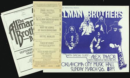 A fine grouping of Allmans concert handbills includes: 1) Oklahoma City Music Hall, Mar. 26, 1972 , 8.5" x 11", EX., 2)Oakland Coliseum, Sep. 25, 1973, other shows included Faces, Bette Midler, John Mayall, Mott The Hoople, Joe Walsh & others. 3.5" x 8.5", age toning, fading, and; 3) Portland, OR, Paramount Theatre, 1980's, 5.5" x 8.5", quarter-folded, scuffed and wrinkled.