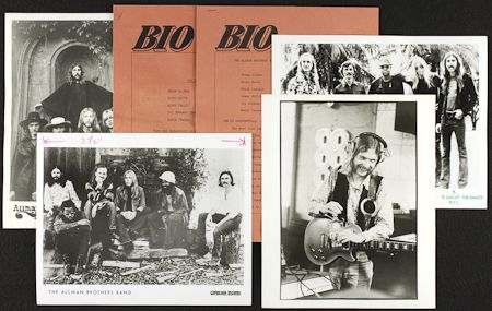 This excellent lot of Allmans material includes: 1) a 7 pg. Capricorn Records press biography, March 1972, 2) 8 pg. Capricorn press biography, December 1972, and 3-6) four 8 x 10" publicity photos, two picturing Duane Allman, two bearing handwriting on the lower border. Fine.