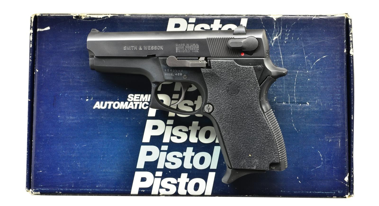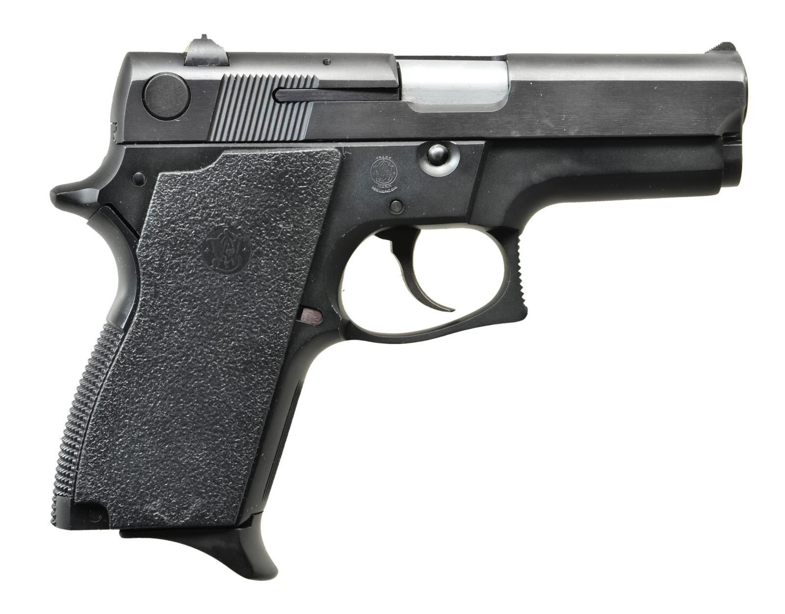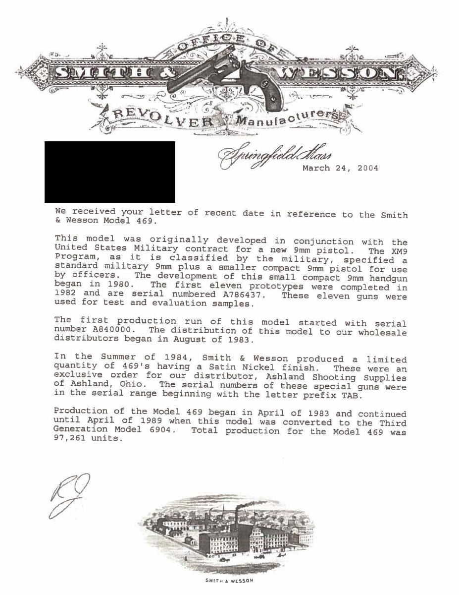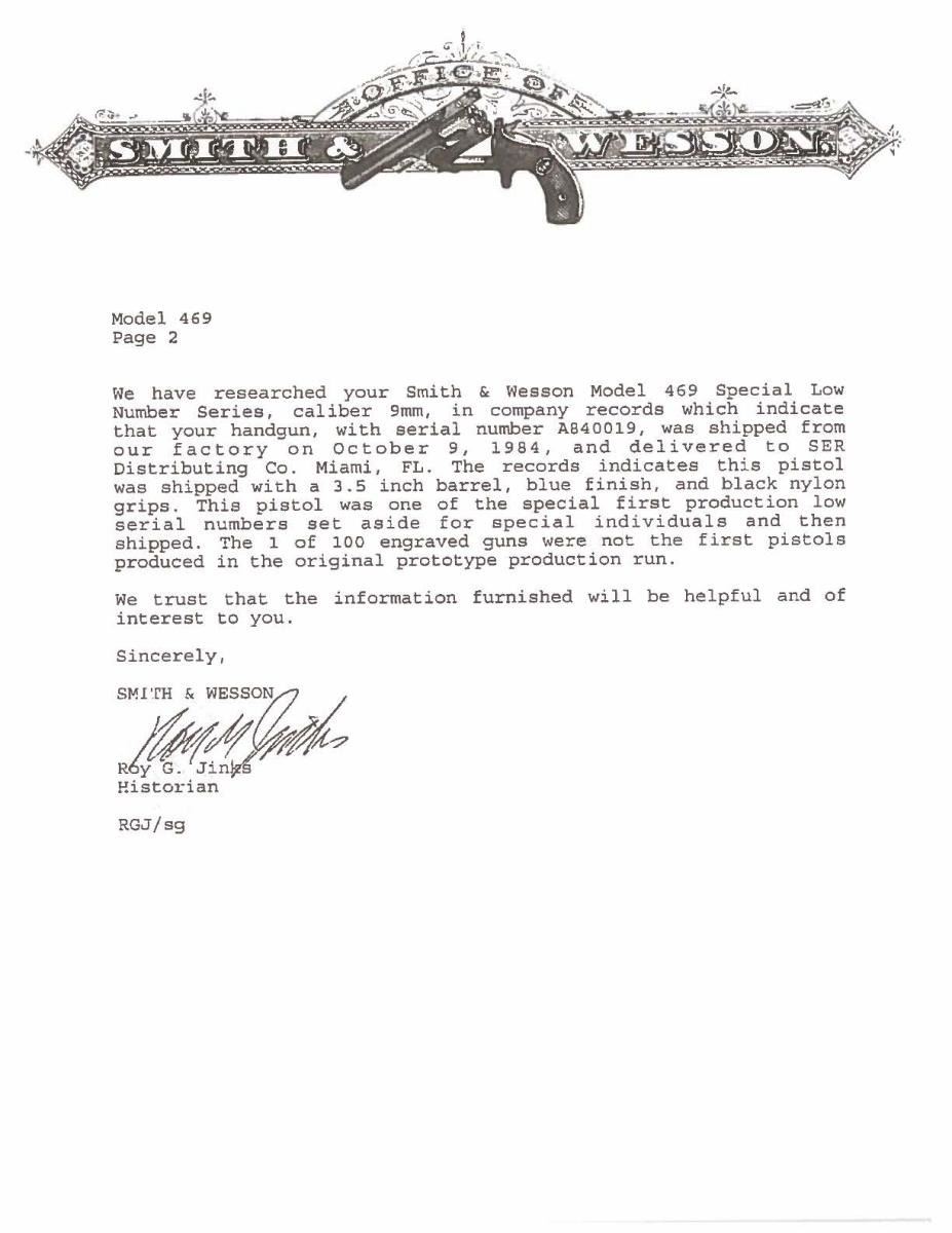 Cal. 9mm. S# A840019. Bbl. 3 1/2". Dark matte black alloy frame traditional dbl. action. Serrated slide w/ fixed serrated front & drift adj. white outline rear sights. Left side safety/decocker. Left side controls. Serrated front strap & bobbed hammer. Checkered triggerguard front & backstrap. Gently bevelled mag. well. Mfg. 1983-1988. MAGS: 2-12 rd. factory mags. UNATTACHED ACCESSORIES: blue factory cardboard box w/ original cleaning kit & paperwork. Also included is a March 24, 2004 two page Roy Jinks letter detailing the history of the Model 469. This revolver left the factory Oct. 9, 1984 as " This pistol was on of the special first production low serial numbers set aside for special individuals and then shipped." CONDITION: finished coverage on exposed metal surfaces is complete & consistent w/ the majority of thinning at areas of mechanical intervention. Shiny bore w/ strong rifling. Fire control mechanism appears to function correctly when cycled by hand. PROVENANCE: Estate collection of Fred Inganamort. (22-1636/JZ). MODERN. $400-600.