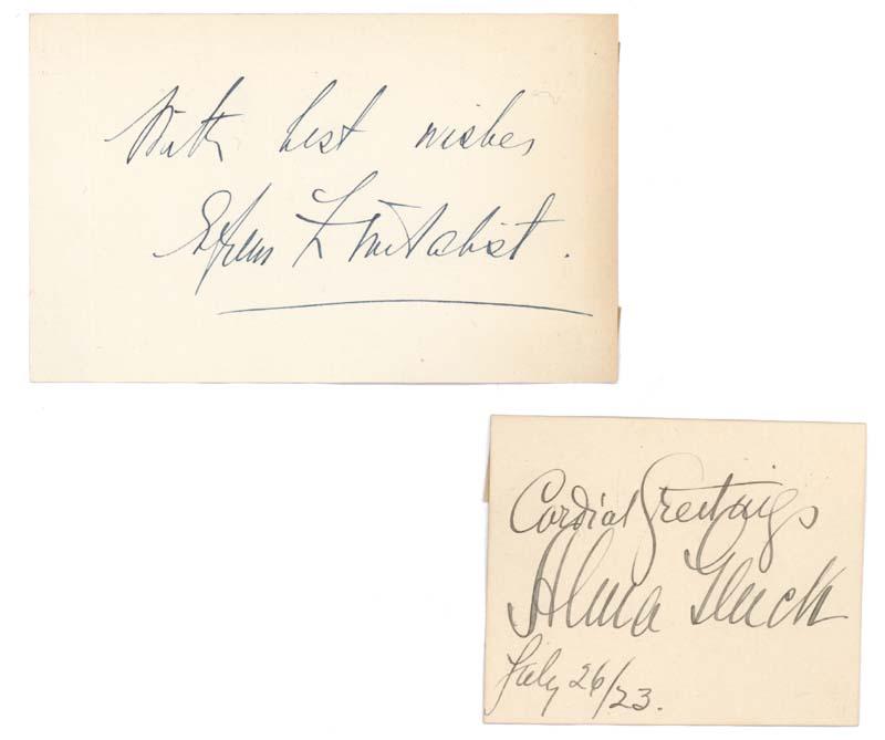 ALMA GLUCK & EFREM ZIMBALIST ALMA GLUCK (1884-1938) American soprano and one of the world's most famous singers. 3 1/4" x 2 3/4" card Signed "Cordial Greetings Alma Gluck." No place. July 26, 1923. Tape on verso. Overall Very Fine. EFREM ZIMBALIST (1890-1985) Prominent concert violinist, composer, teacher, conductor and director of the Curtis Institute of Music. 5" x 3 1/4" card Signed, "With best Wishes, Efrem Zimbalist." No place. No date. Tape on verso. Slight discoloration at right edge. Overall Very Fine. A fine pair from this famous musical husband and wife.