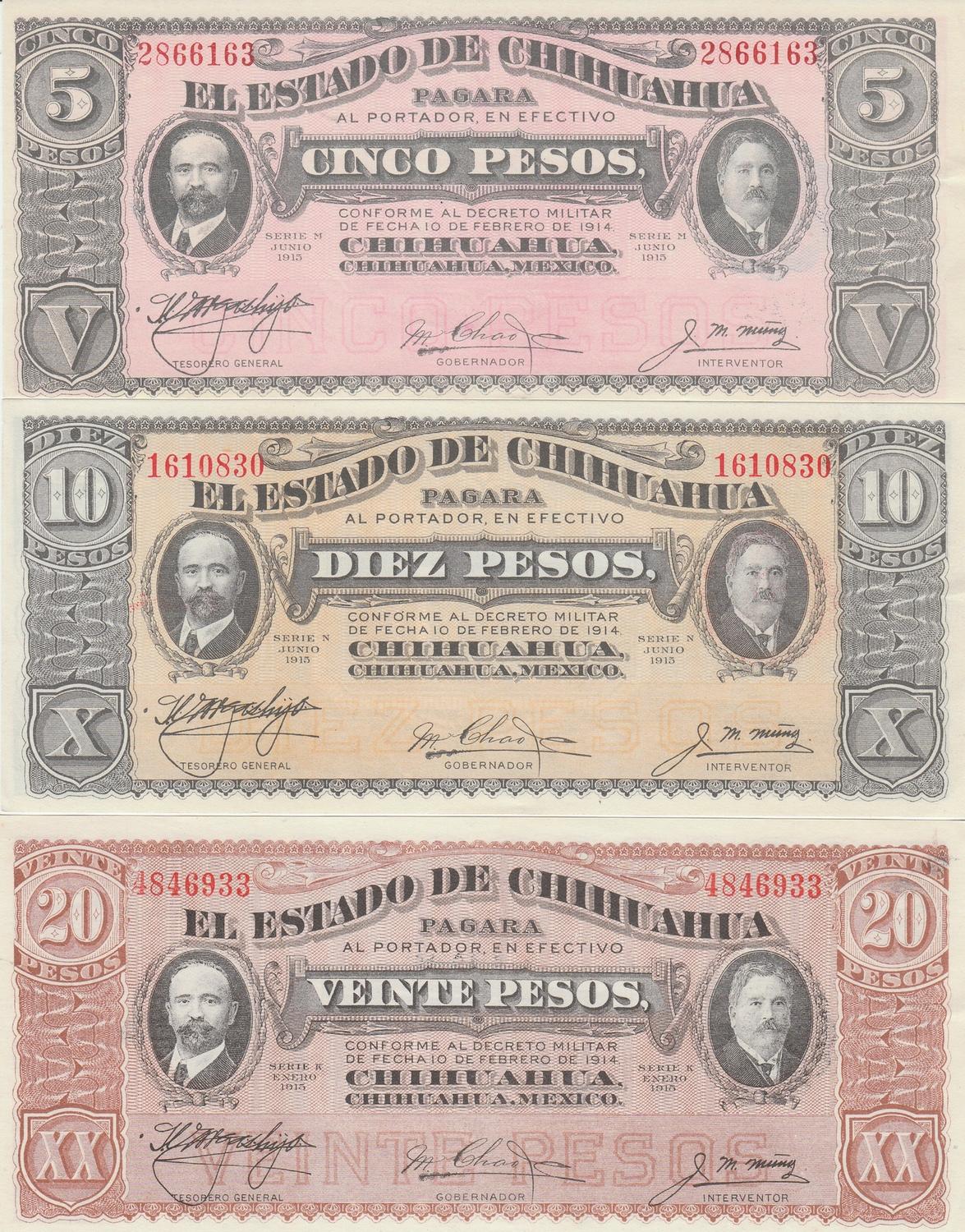 ALMOST 100 YEARS OLD 5, 10, 20 PESOS MEXICO BANKNOTES UNCIRCULATED 1914 SERIES
