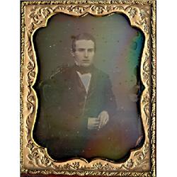 ¼ plate daguerreotype of a seated young man, sealed with late seal (not filmoplast.) Corners slightly roughened, one minute nick.