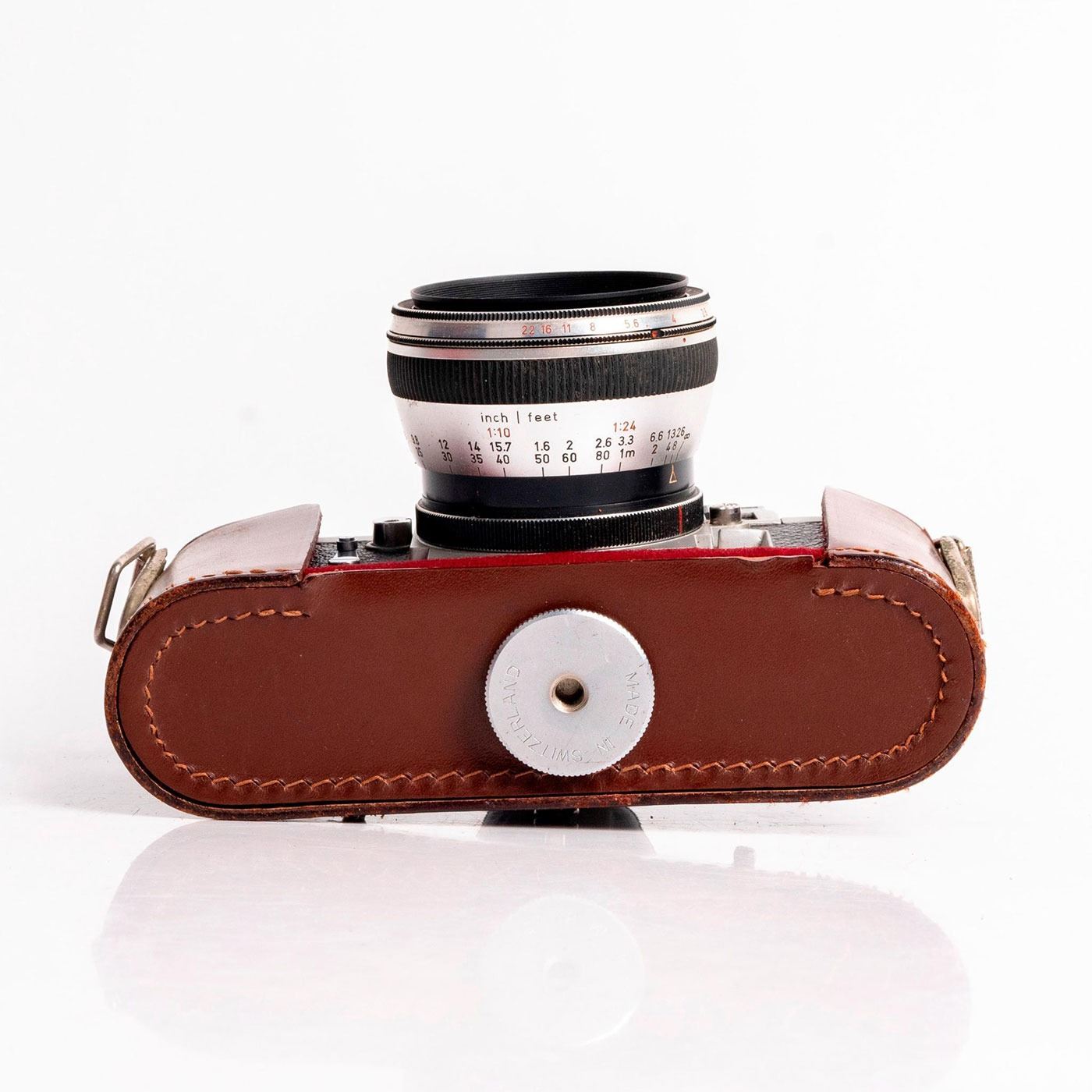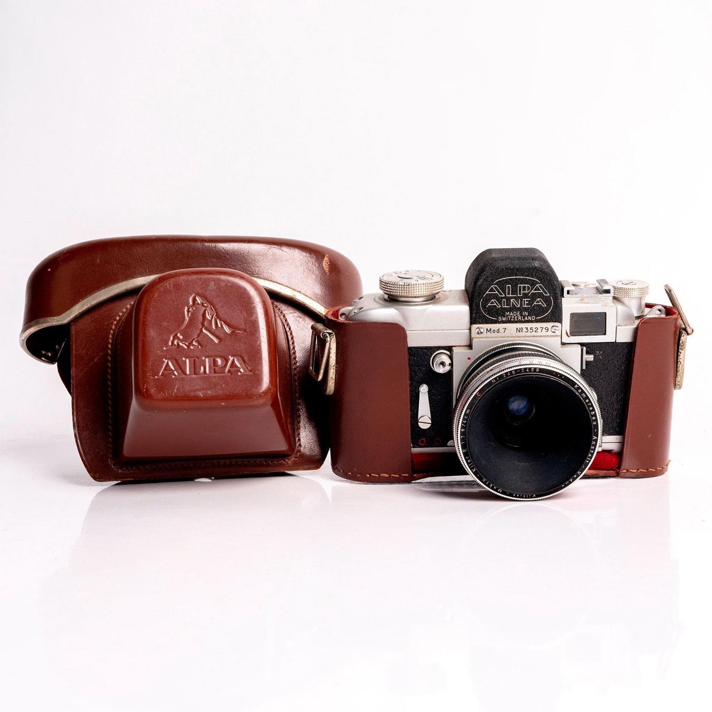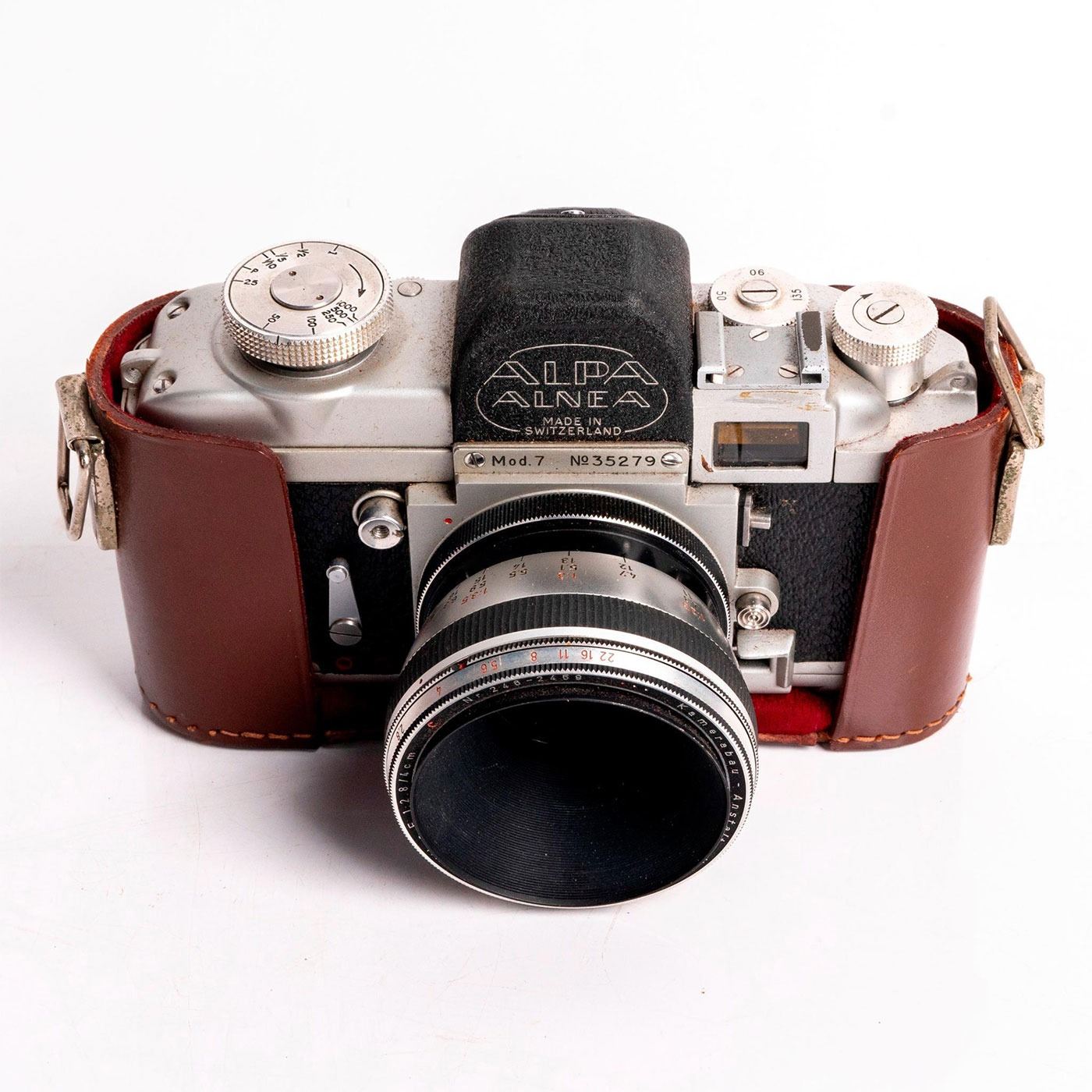 The camera is an SLR and a rangefinder. Alpa Alnea Model #7 and made in Switzerland. The lens is a 4cm f/2.8 Kilfitt-Makro-Kilar macro lens. Shutter mechanism is broken. Cameras and Photographica