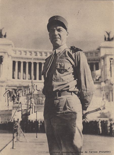 (1888 - 1967) French marshal, commanded the French Expeditionary Corps in the US Fifth Army. Juin made the plan to break the Gustav line; took the Belvedere, Monte Majo, attacked the Liri valley, won the battle of the Garigliano, the battle of the East of Rome and played an important part in the battle for Siena. Rare S.P. 5" x 7" b/w, a three-quarter length standing pose, boldly signed, Paris, Feb. 16, 1952. Very good.