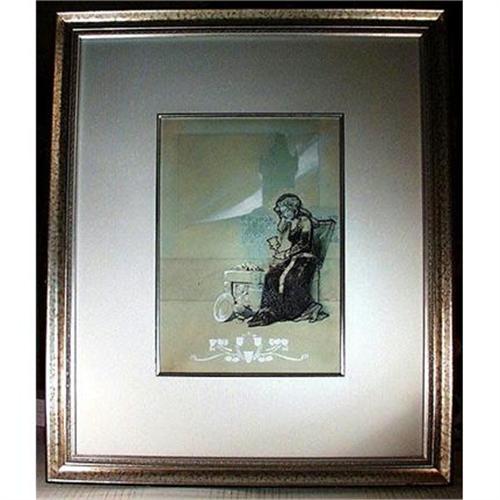 Exquisite GOUACHE depicting young woman sitting on a chest and holding a chalice. In the background is Prague's "Prasna Brana" (Powder Tower), a Gothic building from 1475, which was once probably used to store gunpowder. Girl's headband and lower part of picture is decorated with Linden leaves, a symbol of Bohemia (Czechoslovakia). This Artwork on heavy cardboard is most likely a study for silverware advertisement. Signed Mucha in lower right. Museum mounted and framed, silk matted, image size 13 x 18 inches, frame size 27 x 32. Excellent condition. It has been authenticated by Mr. Carrini of Chicago Art Institute back in the early 1980's. It is guaranteed to be Alphonse Mucha ORIGINAL. Please note that original Mucha posters printed in thousands are highly prized and sell up to $30,000.00. This piece was done by Mucha's hand and is the only one in existence. Please email for additional photos....Please note that for Ebay Live Auction only bids at or over $11000 will be succesfull and meet our reserve....