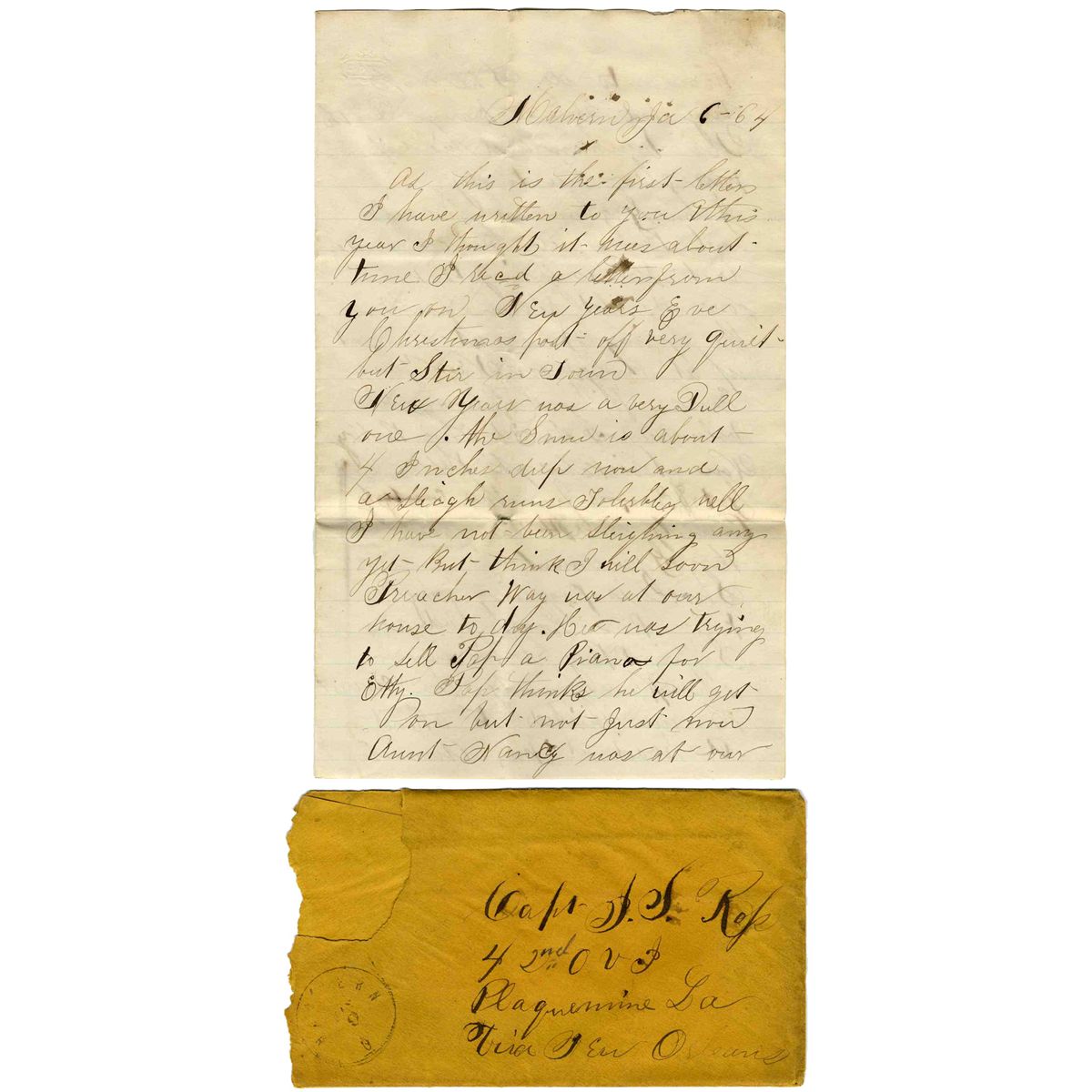 Letter to Captain Jasper S. Ross of the 42nd Ohio Infantry. Accompanied by cover. Written in ink and datelined ''Malvern Ja 6-64,'' Captain Ross's younger brother writes to him with news from home: ''…The snow is about 4 inches deep now and a sleigh runs tolerably well…Preacher Way was at our house to day. He was trying to sell Pop a piano…Pop thinks he will get one but not just now. Aunt Nancy was at our house to day. She looks very bad since Marions death. Mr.Vanhorn and his wife were also here to day. John Graham and his wife and babies were here on Sunday last. He is going to move on the old Sidon for in the spring…Billy Hillerman has volunteered and the 3rd Ohio Battery is now at Vicksburgh. He got $300.00 from the County and $402 from the Government. School is progressing very well…I guess I have written almost all the news all at least that I can think of. So I guess I will close wishing you good night…'' The 42nd Ohio Infantry saw action at Middle Creek, Vicksburg, Fort Hindman and Champion's Hill. Jasper Ross was commissioned into Field and Staff of the 42nd on 27 November 1861 as First Lieutenant, and promoted as high as Captain before being discharged. Letter measures 5'' x 8'' and runs 3pp. Mild foxing throughout and chipping at top edge, otherwise near fine condition.