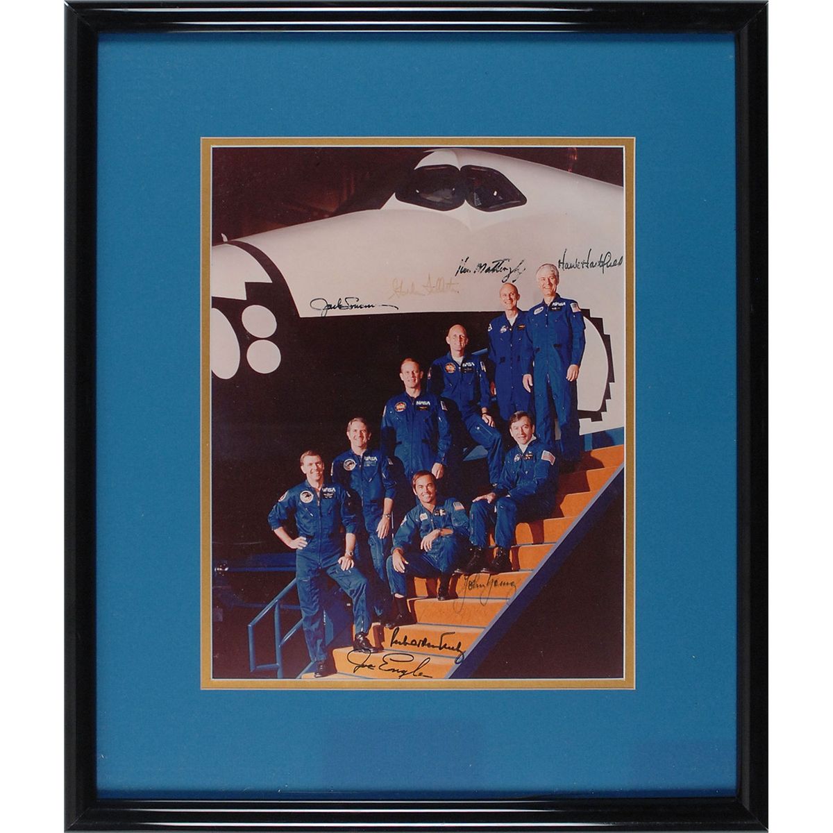 Color semi-glossy 10 x 13 photo of the first four shuttle crews, signed in black felt tip by all pictured: John Young, Bob Crippen, Joe Engle, Dick Truly, Jack Lousma, Gordon Fullerton, Ken Mattingly, and Hank Hartsfield. Double-matted and framed to an overall size of 17.5 x 20.5. Moderate irregular adhesion to signatures and a few very light but visible, otherwise fine condition.