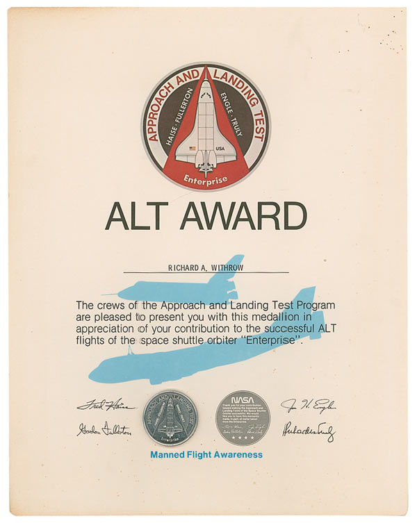 A Manned Flight Awareness certificate, 11 x 14, presented to Richard Withrow for his contribution to the Shuttle Approach and Landing Tests. The certificate reads, “The crews of the Approach and Landing Test Program are pleased to present you with this medallion in appreciate of your contribution to the successful ALT flights of the space shuttle orbiter ‘Enterprise.’” Affixed to the certificate is 1.5-inch diameter medallion made, in part, of metal taken from the Enterprise. Scattered toning, foxing at the upper right corner, and light wrinkling and creasing, otherwise fine condition. The Manned Flight Awareness Program was instigated to impress the importance of crew safety on the minds of everyone involved with America's manned space flight program.