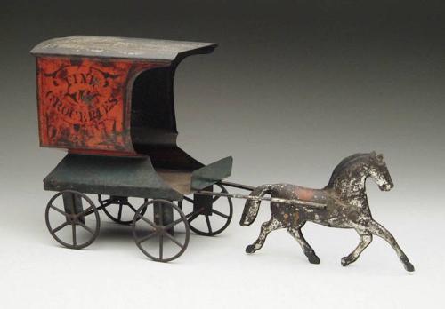 ALTHOF BERGMANN FINE GROCERIES CART. A wonderful cart painted red with "fine groceries" stenciled on both sides with a silver roof, four cast iron wheels, being a pulled by a black horse with red saddle. SIZE: 12" l x 67/8" h. CONDITION: Wear to roof of cart and some wear to horse. Overall condition very good. 1-5361 MC