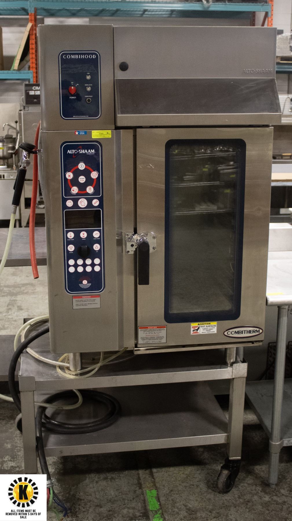 W/ EQUIPMENT STAND ON CASTORS. COMBITHERM MODEL # 10.10 IN/ML, 208-240 VOLTS, PHASE 3, 18300 WATTS, 50/60 HZ, COMBI HOOD MODEL # VIIML-5, 208-240 VOLTS, 100 WATTS, PHASE 1, 50/60 HZ. 32"X32.5."X74"