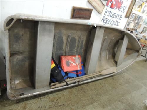 ALUMACRAFT MODEL E OUTBOARD 12' MOTOR BOAT: ALL ALUMINUM CONSTRUCTION, OAK OARS, LIFE PRESERVERS. AS SHOWN. VIEW PICTURE FOR DETAIL.
