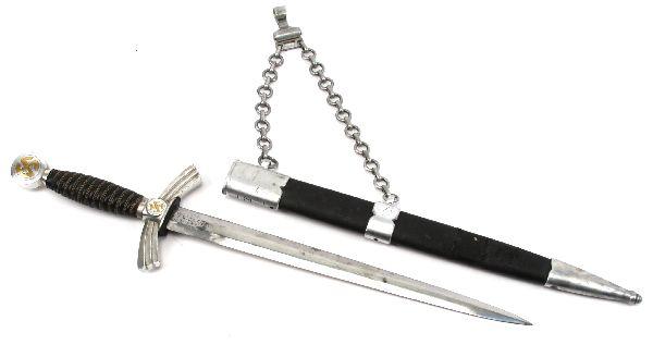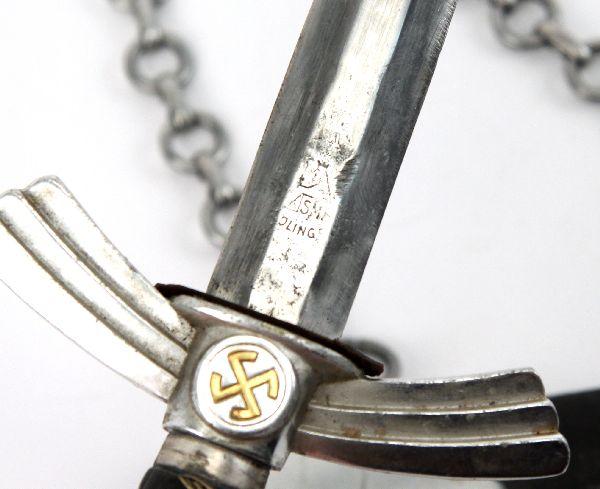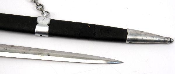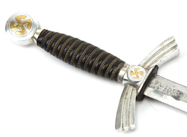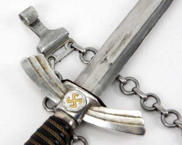 Aluminum First Model Luftwaffe dagger, complete with hang chain and belt loop. SMF, Solingen makers mark, with seated king logo on blade. Scabbard wear to blade, as well as handling wear overall. Wire wrapped grip in very good condition. Dings to aluminum fittings on scabbard. Overall good condition.