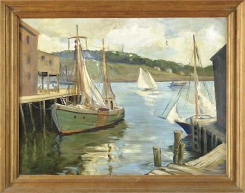 ALVA GLIDDEN (Early-Mid 20th Century) GLOUCESTER OR ROCKPORT HARBOR SCENE. This oil on canvas depicts boats at dock with a pier and buildings in foreground and a sailboat and dory in the background with a village. Signed in lower right, "ALVA GLIDDEN". With an attached presentation on reverse "PAINTED BY ALVA GLIDDEN WITH LOVE TO CHRISTINA." Framed in natural wood-colored molded frame. SIGHT SIZE: 22-1/2" h x 29-1/2"w. CONDITION: Generally very good. 9-28065