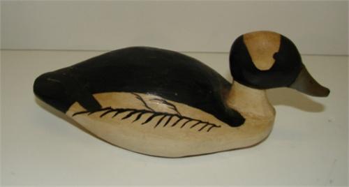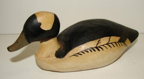 ALVIN MEEKINS MINIATURE BUFFLEHEAD DECOY. Signed on bottom "ALIVIN/MEEKINS/1950". 6" L