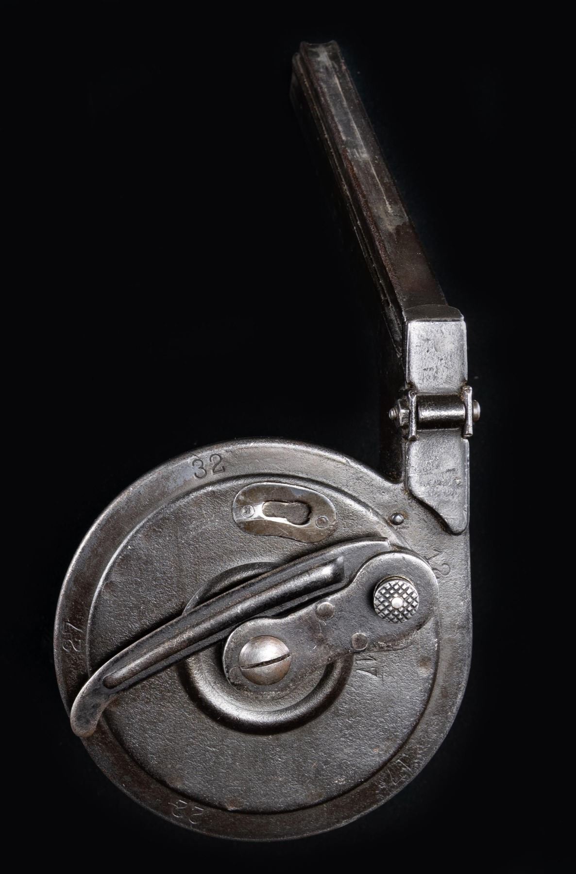 Second Model Luger snail drum mfg. during World War II. Front of the drum body and rear plate are stamped with the S# "608417" and a "B/ -/ N" proof, with "12", "17", "22", "27", and "32" stamped around the circumference of the rear plate. Mag. and drum bodies exhibit a blue finish, with the rear plate and winding mechanism exhibiting a black painted finish. CONDITION: good, with metal components retaining the majority of their arsenal finishes, exhibiting some areas of light to mild wear, some pitting, as well as some patches of light to mild surface oxidation. Winding mechanism is sound and retains strong spring tension. (02-25517/MLW). NON-GUN. $700-1,000.