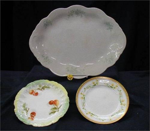 AM. TURN OF THE CENTURY (1) IRONSTONE DIXIE C.R.CO. OVAL PLATTER 18inL X 13 5/8inW (W/HAIRLINE) GREEN FLORAL DESIGN, (1) SEVRES 8 1/2in PLATE W/CHERRIES (W/RIM FLAKE), (1) 8 1/4in PLATE DAISY EXCELLENT, 3 PC