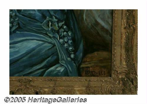 <B>AMANDA BREWSTER SEWELL (American 1859-1926)</B></I><BR>Woman in a Blue Dress<BR>Oil on canvas<BR> 45in. x 36in.<BR>Signed lower right<BR><BR>Condition Report: Unlined original canvas, small (1in.) tear upper right repaired and overpainted, small tear upper left (1in.) repaired and inpainted, 4in. vertical tear in left shoulder repaired, substantial inpaint in face and background upper left, scattered overpaint along top edge<BR>