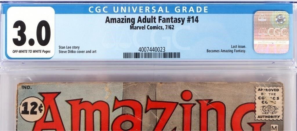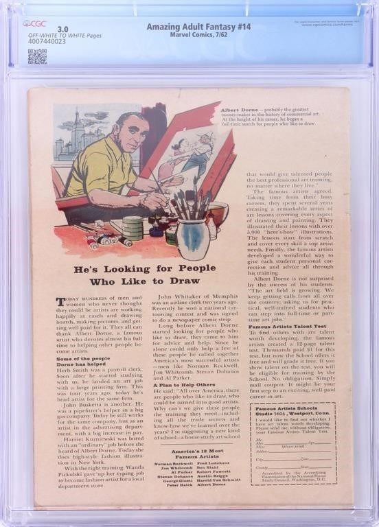 Amazing (adult) Fantasy #14 marvel comic book CGC comic book 3.0. 1st appearance and origin of Tad Carter, an early Marvel mutant, often misrepresented as the first mutant. Carter next appears over 30 years later in X-Men: The Hidden Years (2001).